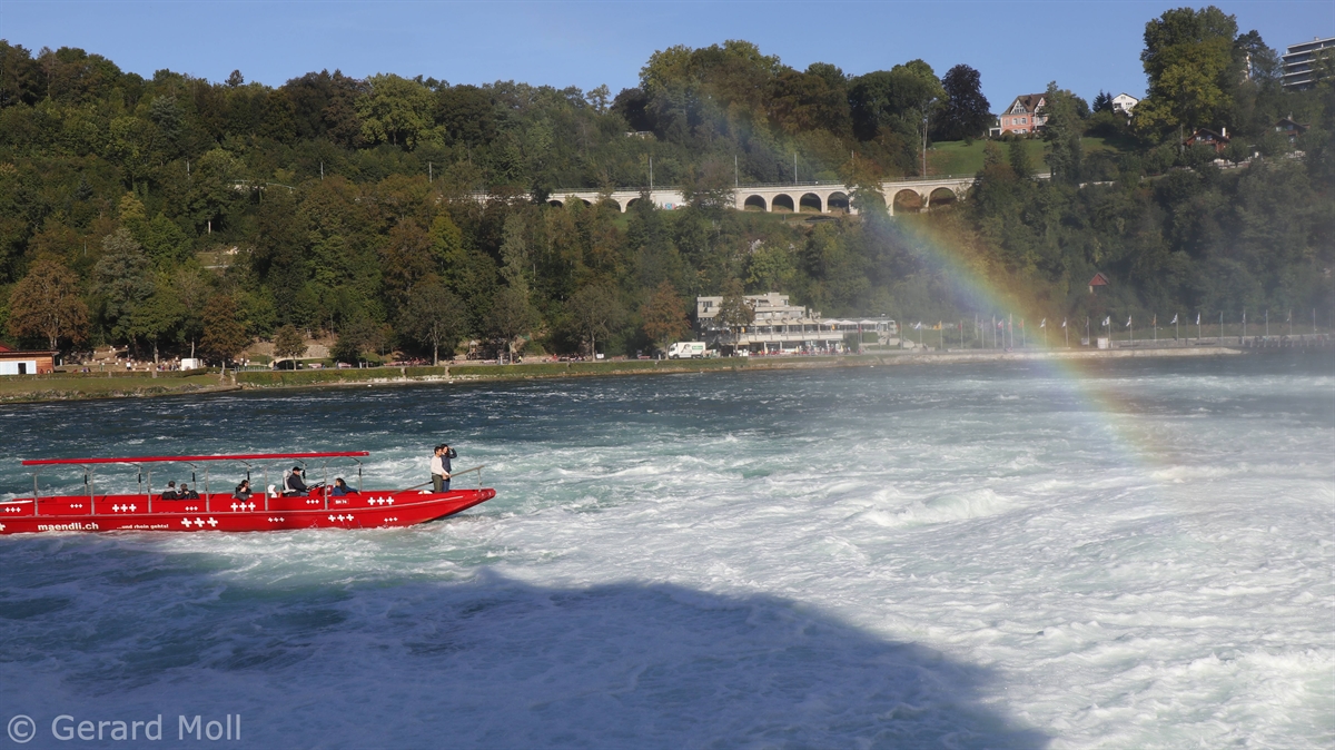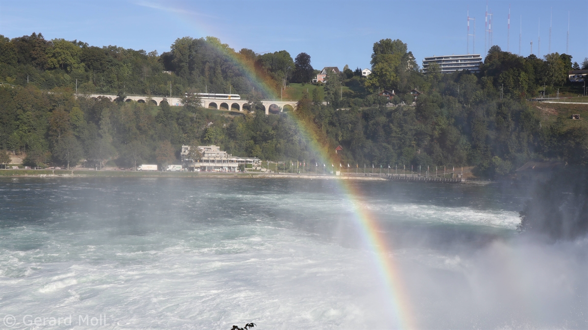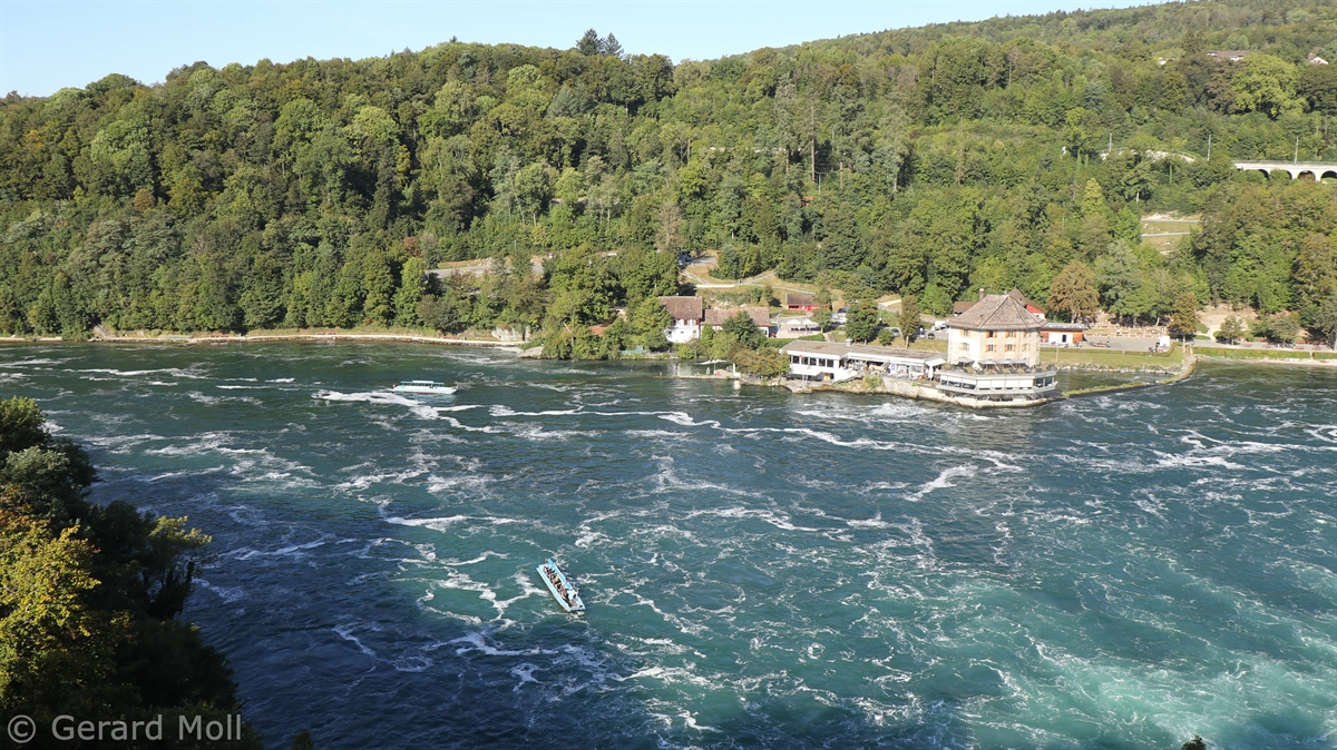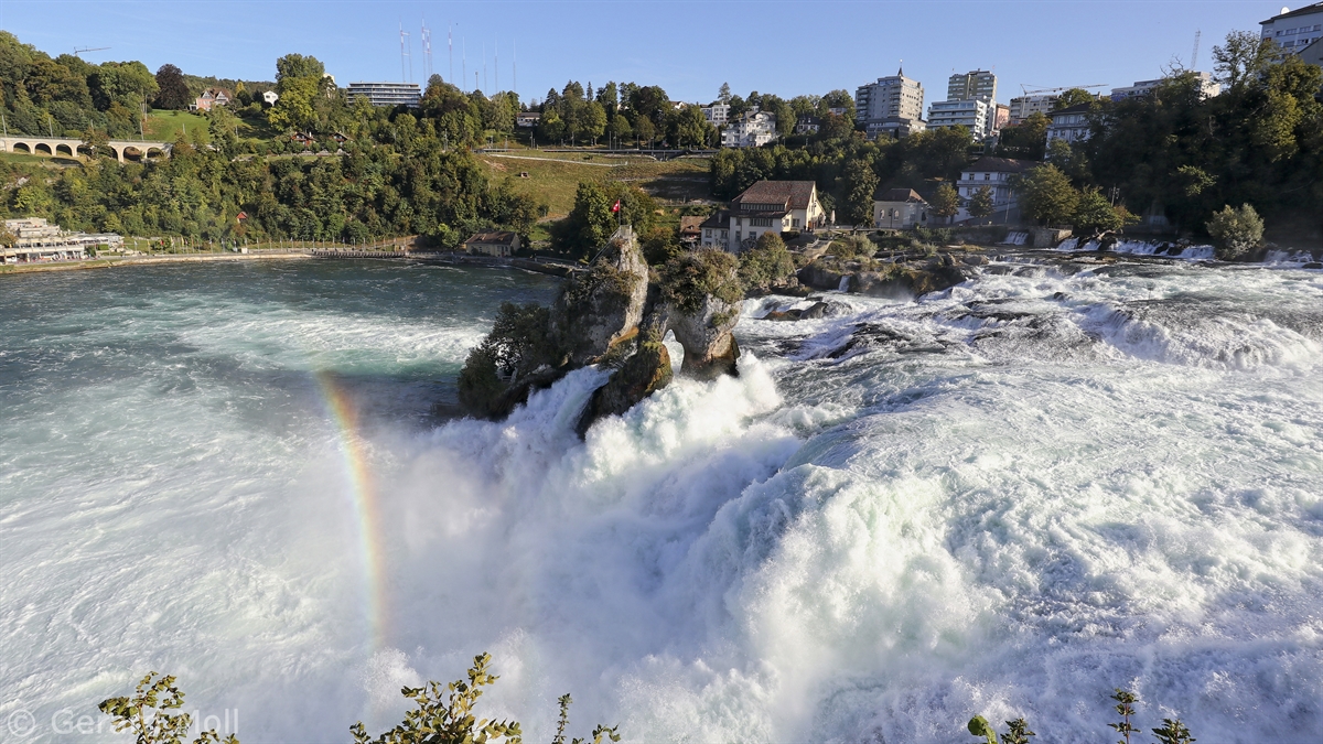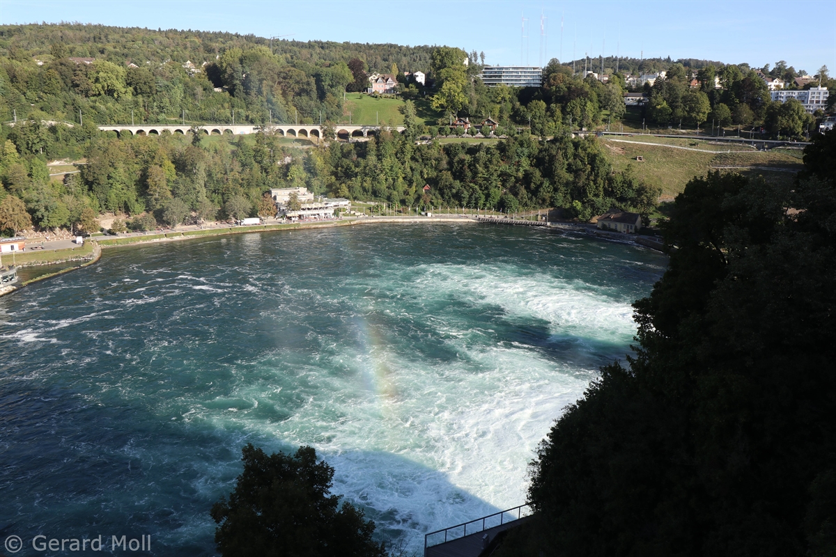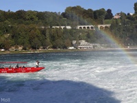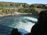 Von dem Schloss Laufen am Südufer des Rheins führt eine gut angelegte Weganlage in die unmittelbare Nähe des Rheinfalls, einer der drei größten Wasserfälle Europas (Fallhöhe 23 m, durchschnittlich 600 m3/sec)