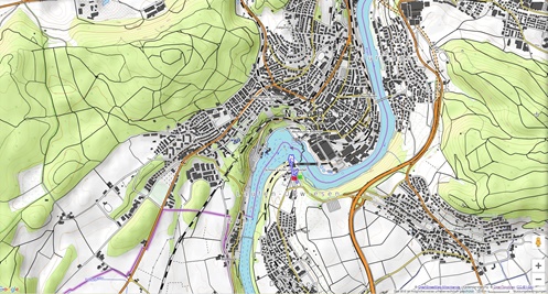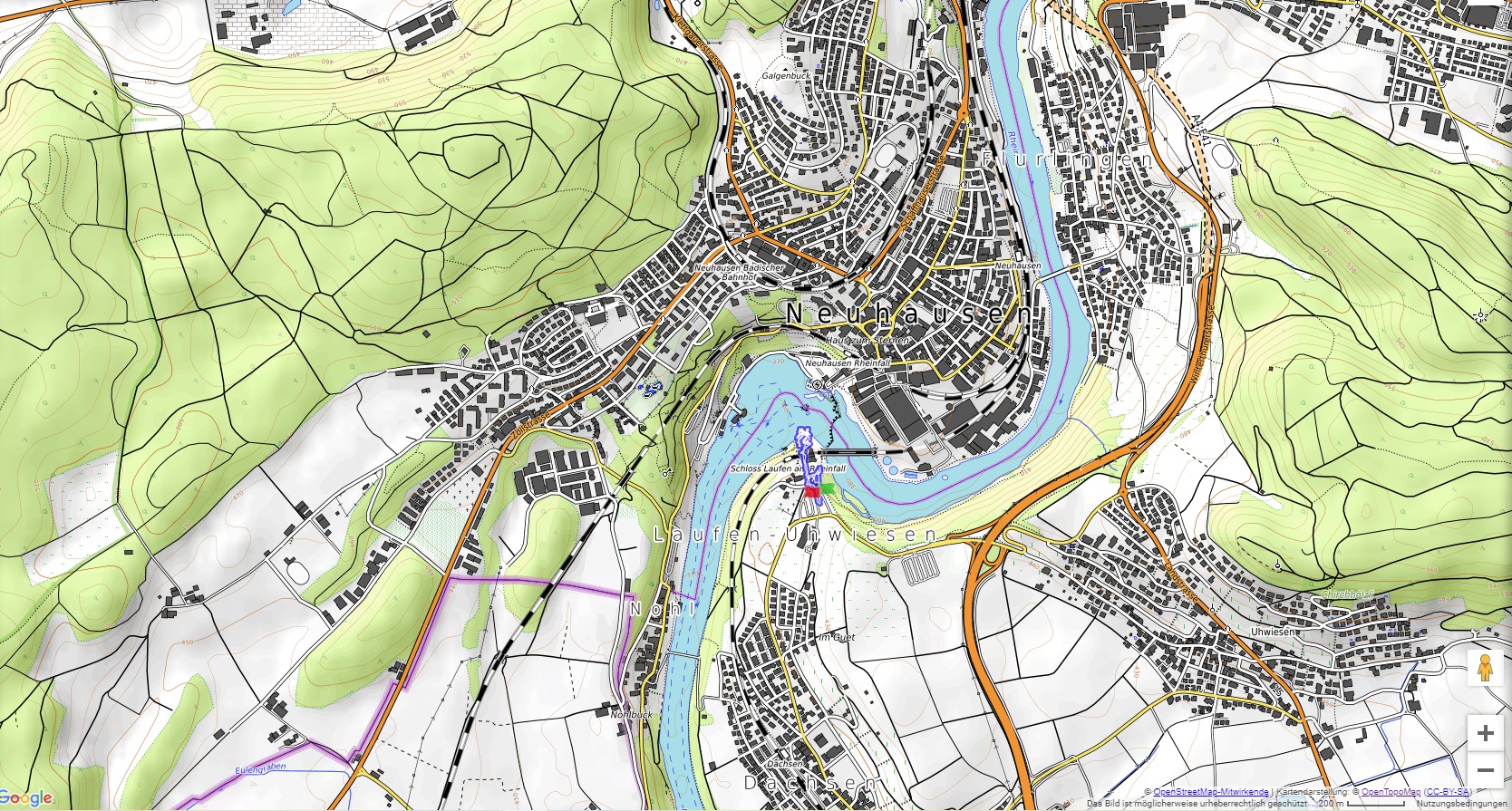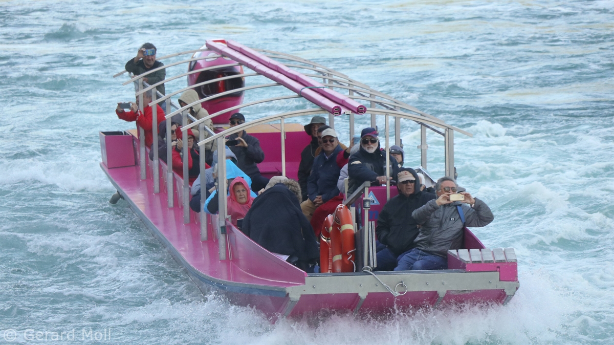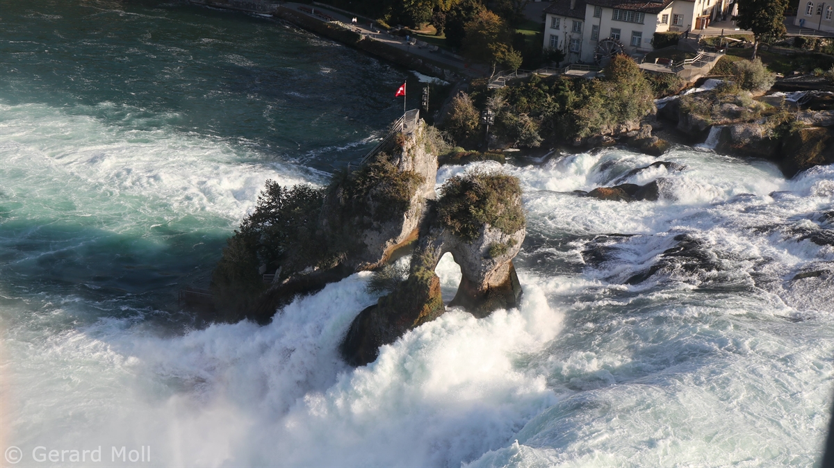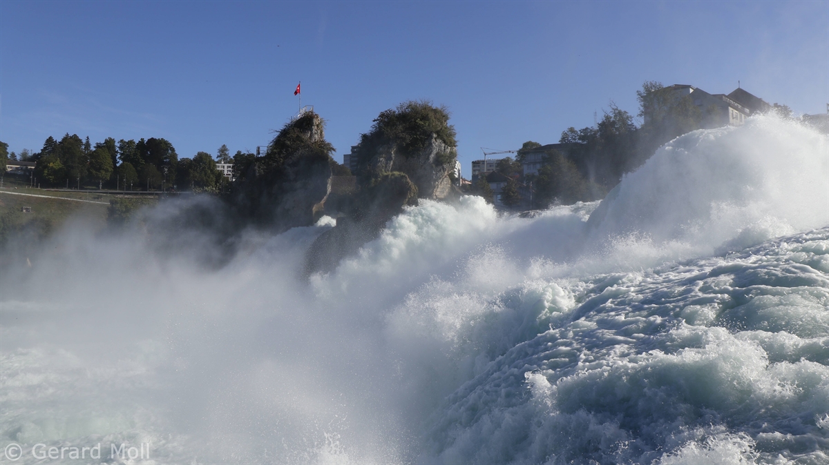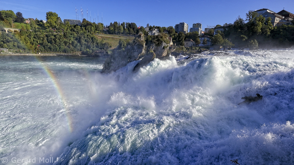 Von dem Schloss Laufen am Südufer des Rheins führt eine gut angelegte Weganlage in die unmittelbare Nähe des Rheinfalls, einer der drei größten Wasserfälle Europas (Fallhöhe 23 m, durchschnittlich 600 m3/sec)