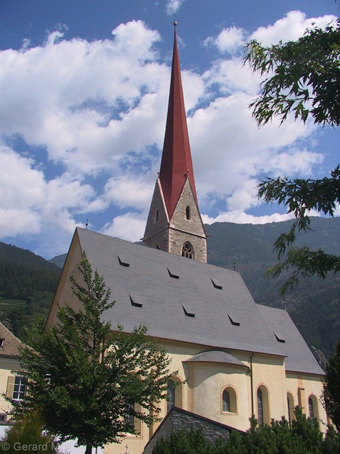 Bild in Lightbox öffnen (open image in lightbox). Besonderes Merkmal der Pfarrkirche Mariä Himmelfahrt ist ihr über 90 m hoher, spitzer Turm, das Wahrzeichen von Schlanders.