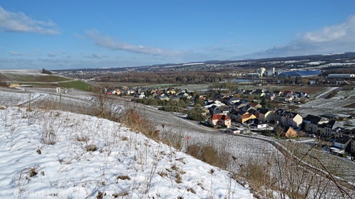 Schön gelegener Ort mit einer auffälligen zweitürmigen Kirche und einem Weinbrunnen.