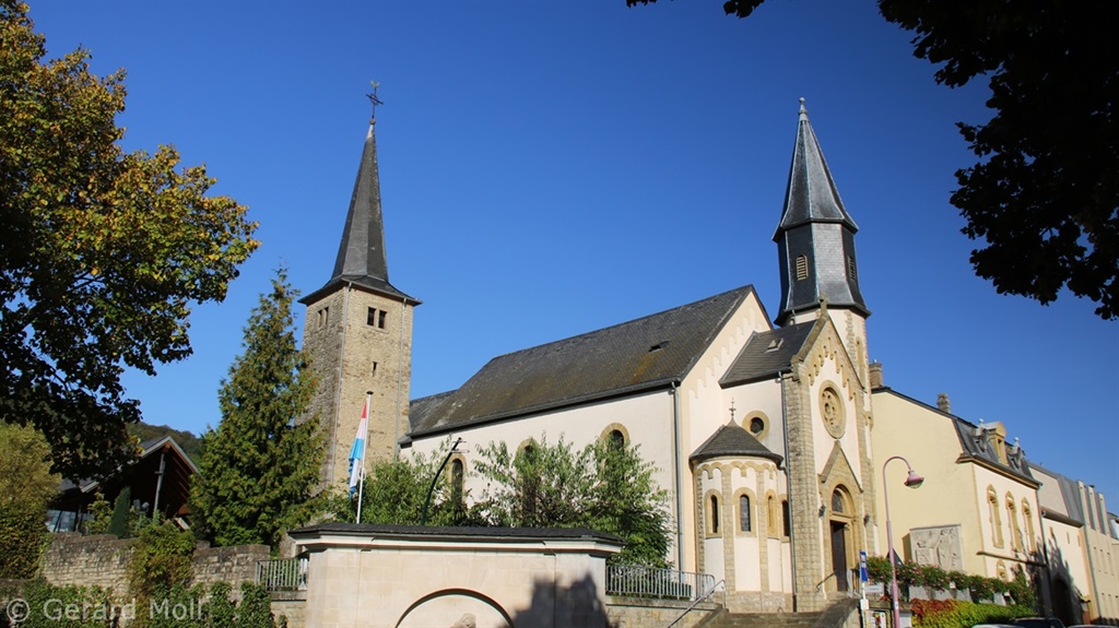 Bild in Lightbox öffnen (open image in lightbox). Der Glockenturm der zweitürmigen Kirche St. Pirminus in Schwebsange stammt aus dem 15. Jahrhundert.