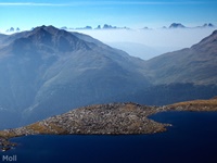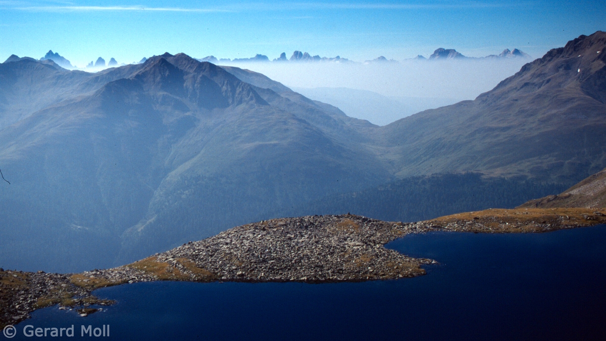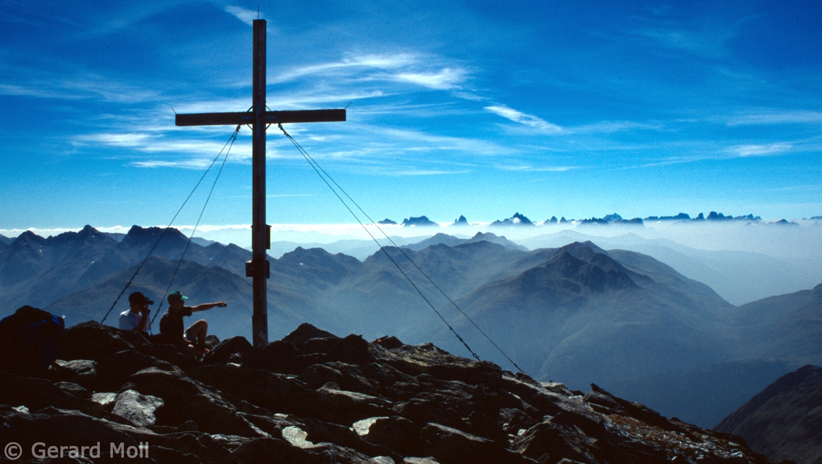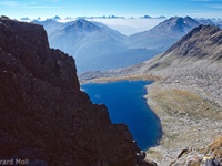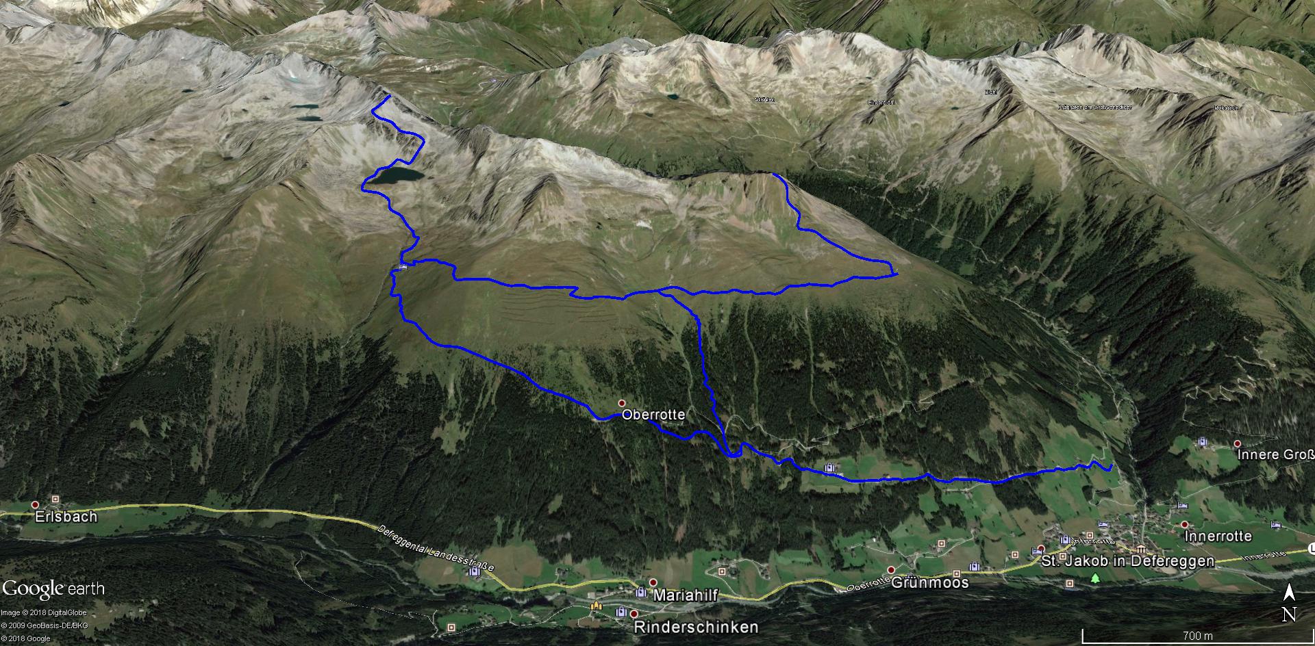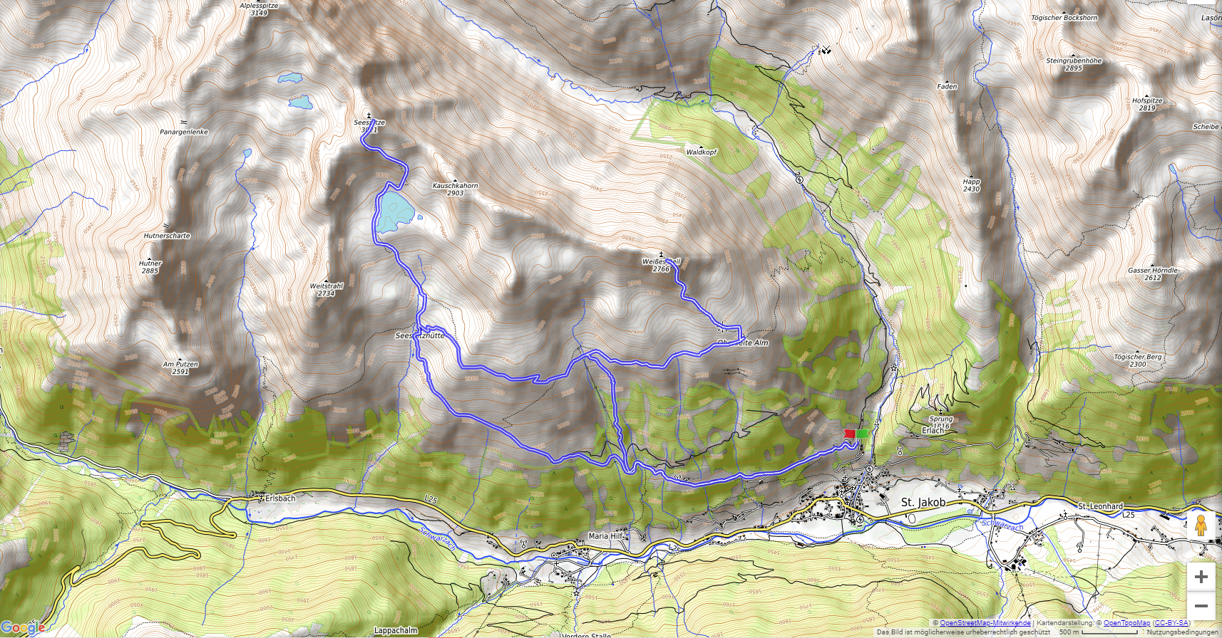 Bei dem Besuch der Seespitzhütte war uns die schöne Seespitze aufgefallen. Deshalb haben wir die Seespitzhütte noch einmal aufgesucht, sind zum herrlichen Oberreitsee (2576 m) aufgestiegen und sind über den teils mit Ketten gesicherten Schlussanstieg zum Gipfel der Seespitze (3021 m) hinaufgeturnt. Der Blick vom Gipfel zu den Hohen Tauern, aber auch zu den nahen Dolomiten ist überwältigend.