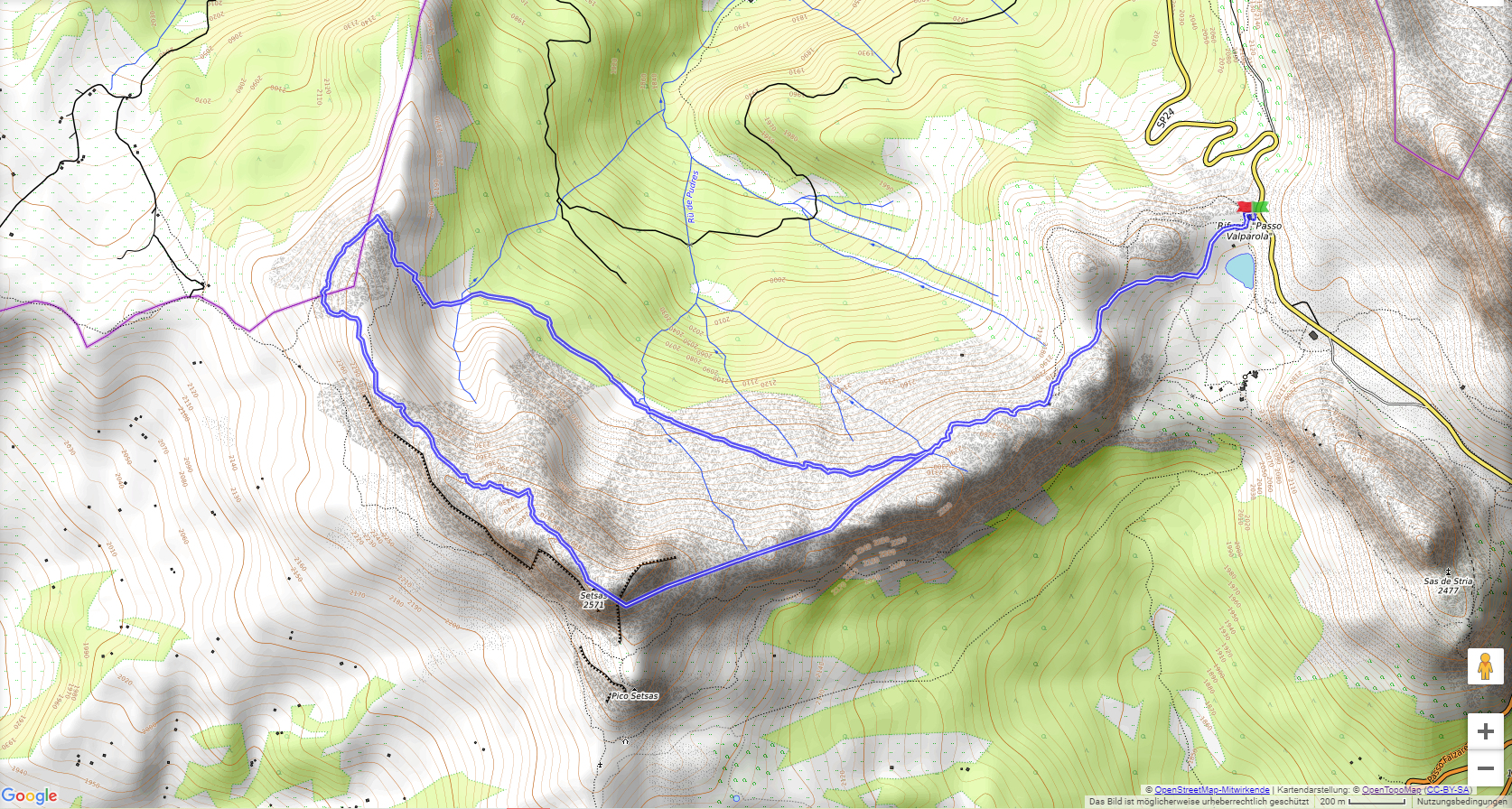 Auch diese Tour führt zu Stellungen aus dem 1. Weltkrieg. Vom Valparolapass (2192 m) gehen wir weglos auf Steigspuren zum Setsas (2571 m) und weiter auf einem Steig bis Les Pizades (2265 m). Unterhalb des Setsas queren wir zurück zum Ausgangspunkt.