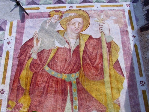 Bild in Lightbox öffnen (open image in lightbox). An der Aussenwand von St. Valentin in Pardell befindet sich dieser heilige Christoph aus dem Anfang des 15. Jahrhunderts.
