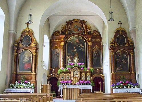 Bild in Lightbox öffnen (open image in lightbox). Die Pfarrkirche Unsere Liebe Frau im Moos, ein spätgotischer Hallenbau, wurde im 18. Jahrhundert barockisiert.
