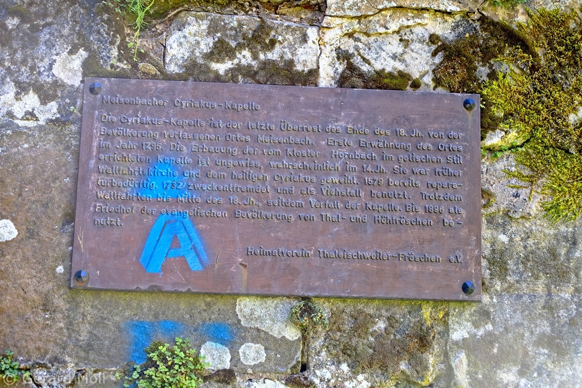 Der Ort Meisenbach bei Thaleischweiler-Fröschen wurde im 18. Jahrhundert von seinen Bewohnern verlassen. Die im 14. Jahrhundert erbaute Cyriakuskapelle am Friedhof von Meisenbach war seitdem dem Verfall ausgesetzt. Eine kurze Wanderung bringt uns zu ihren Überresten.