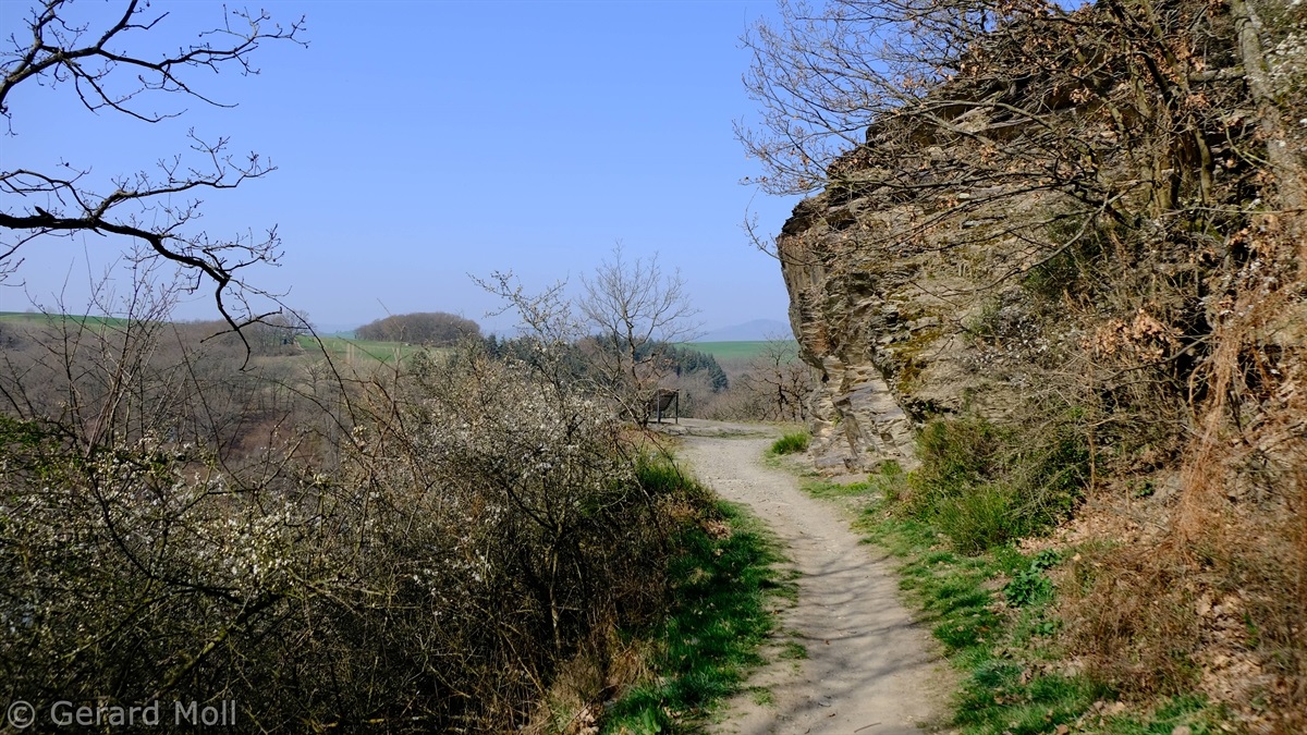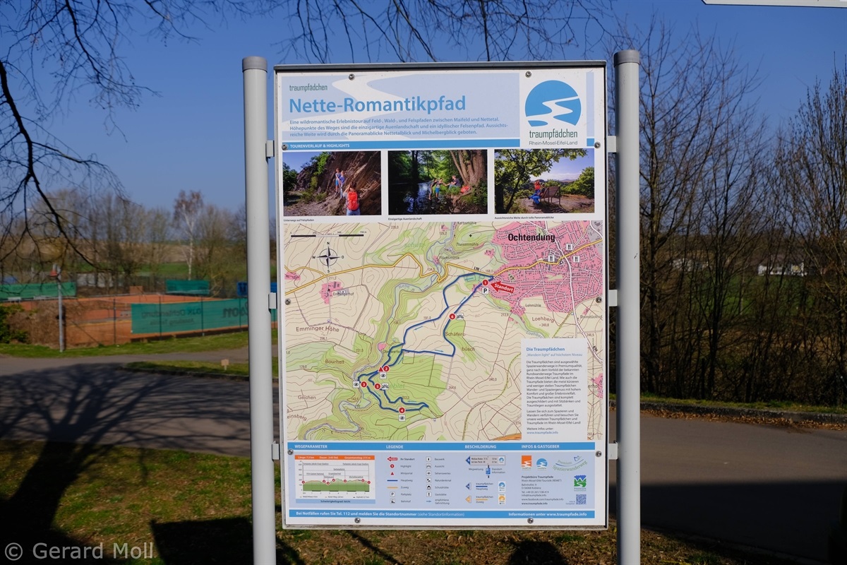 Wir parken am Jakob-Vogt-Stadion in Ochtendung. Über ausgedehnte Felder erreichen wir den Wald und kommen bald zu einer Kreuzung an der Oberwertshöhe. Wir folgen dem Weg nach unten in das Tal der Nette. Bald führt unser Weg wieder hinauf und auf der Höhe folgt der schönste Streckenabschnitt: Auf fast ebenem Weg, vorbei an interessanten Felsformationen, erreichen wir eine Liege und kurz danach eine aussichtsreiche Bank. Von hier sind wir bald wieder bei der Kreuzung an der Oberwertshöhe. Der Weg führt hinauf auf freie Felder, über den Michelbergblick kehren wir zum Ausgangspunkt zurück.