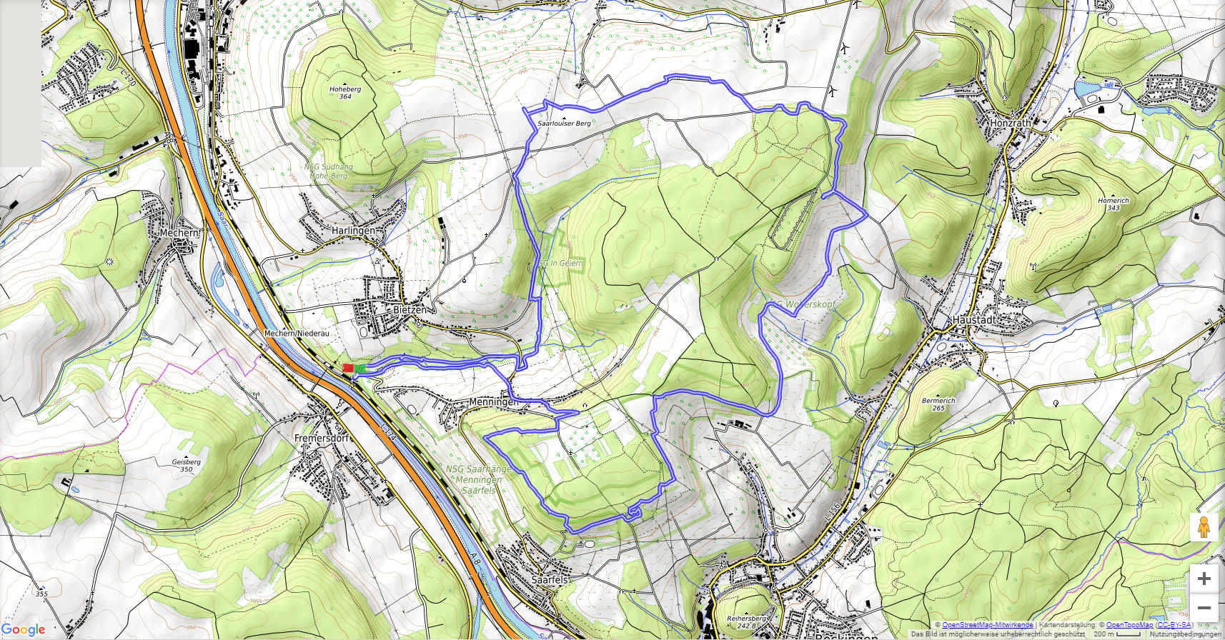 Vom Parkplatz am Bahn-Haltepunkt Fremersdorf gehen wir, vorbei an dem "Runden Türmchen" und Bunkerresten des Westwalls, hinauf zum Aussichtspunkt auf dem Saarlouiser Berg. Der WildeWaldWeg, ein Forstlehrpfad, führt vorbei an historischen Grenzsteinen. Über einige herrliche Aussichtspunkte erreichen wir das Fischerberghaus des Saarwaldvereins. Bei unserer Rückkehr zum Ausgangspunkt kommen wir an der St. Clemens-Kapelle in Menningen vorbei.