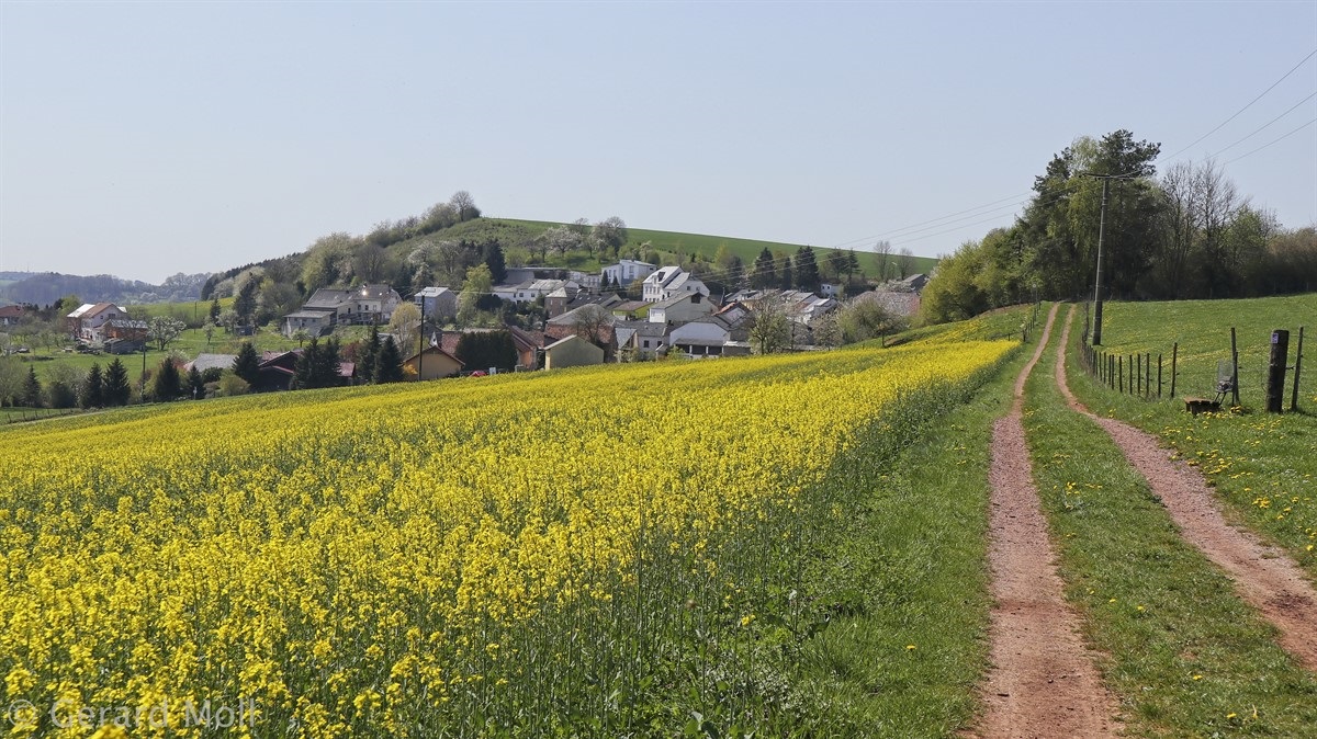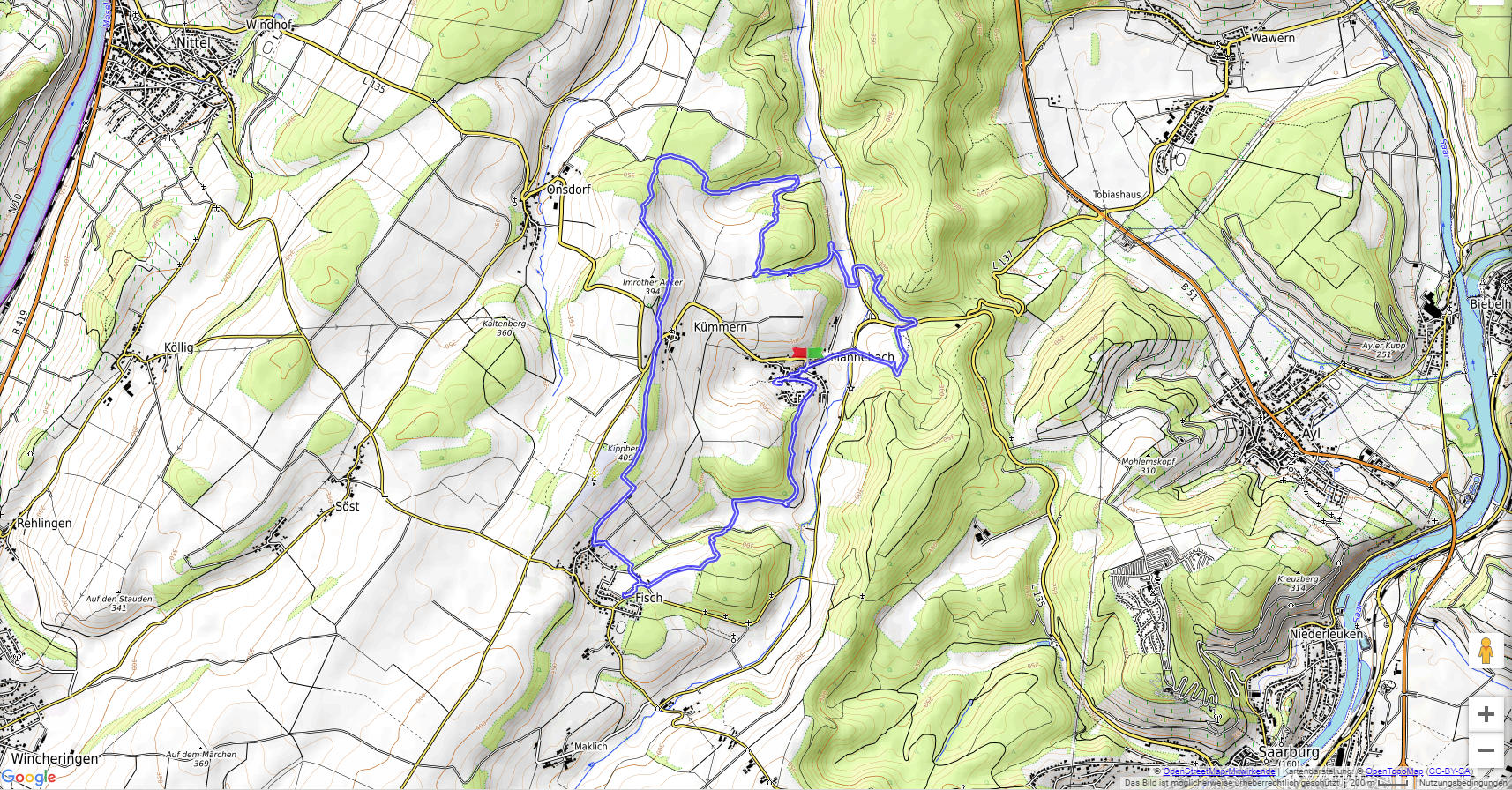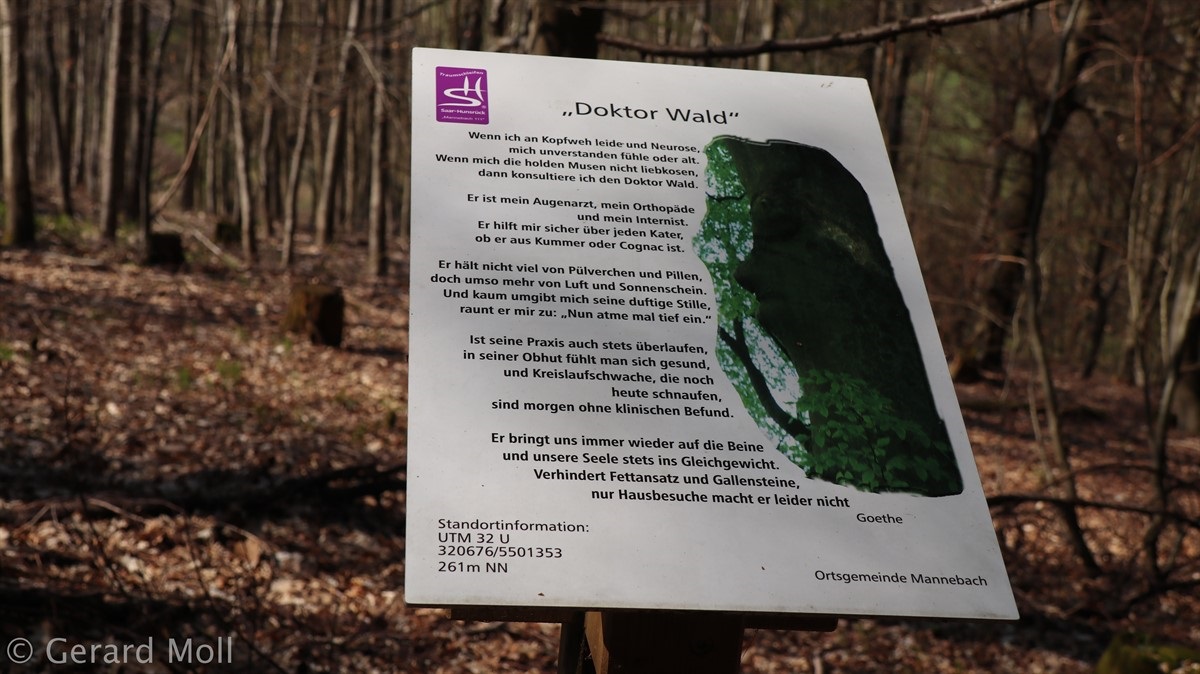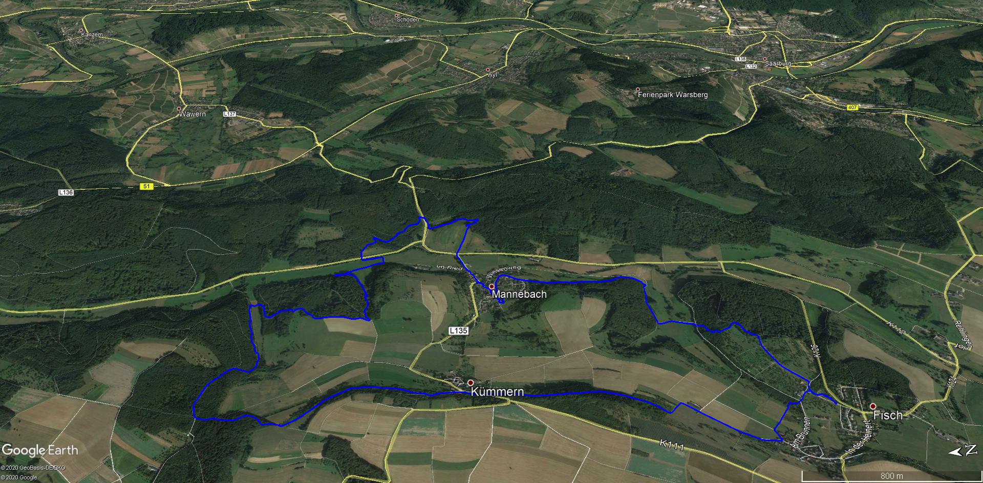 Vom Dorfplatz in Mannebach wandern wir durch Wälder bis zu den Höhlen der Hinkelsgret. Wie bei der vorherigen Tour gelangen wir über Kümmern nach Fisch und zurück nach Mannebach.