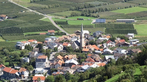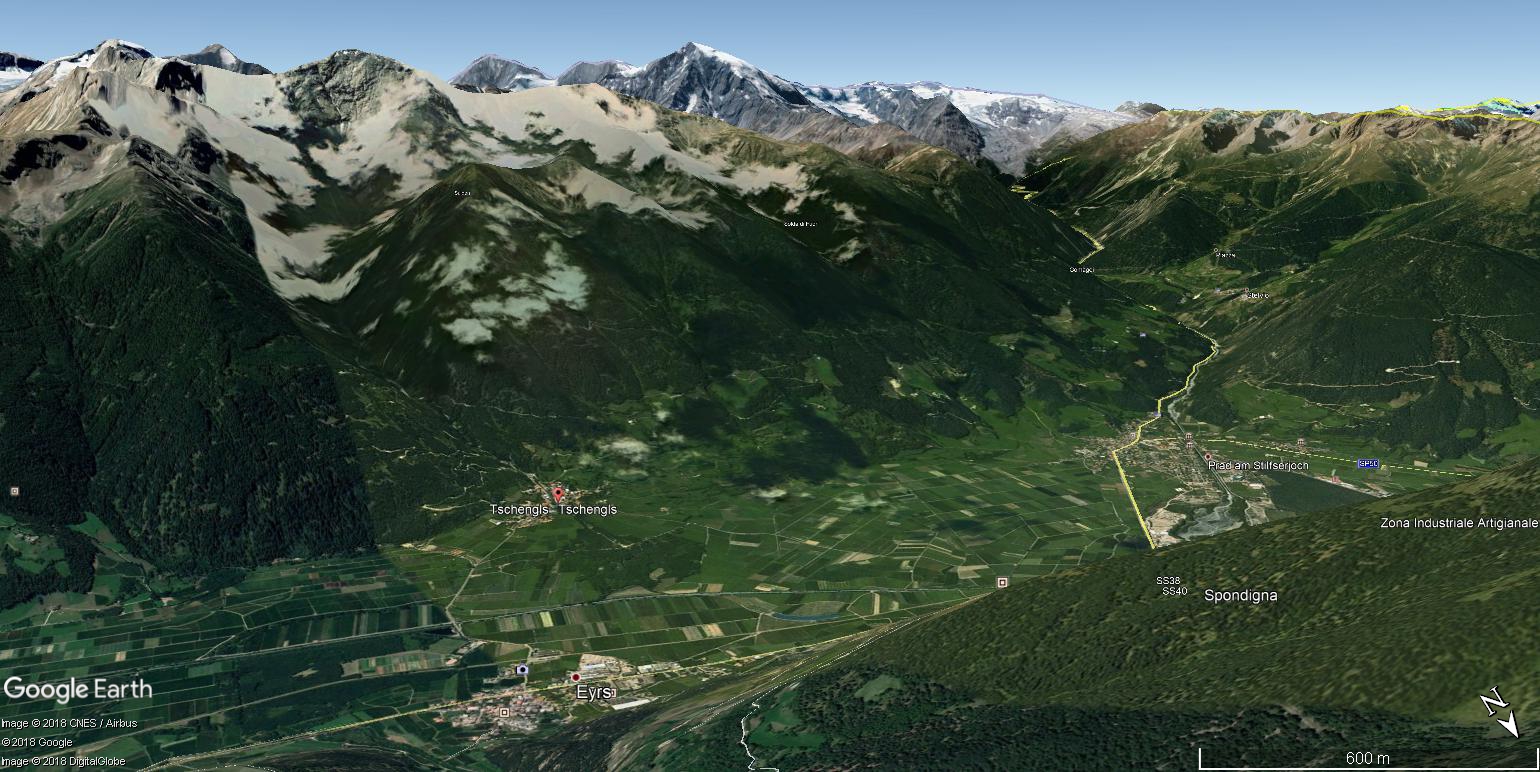 Tschengls befindet sich auf einem Schuttkegel am Fuss der mächtigen Tschengelser Hochwand (3375 m)