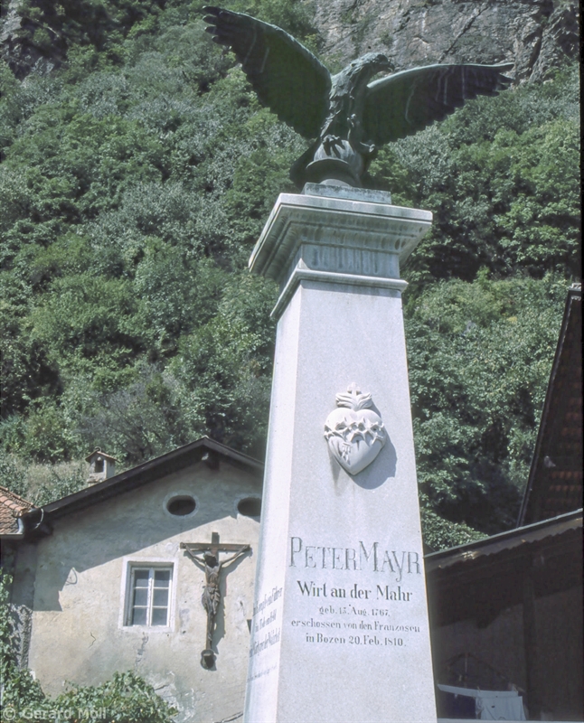 Bild in Lightbox öffnen (open image in lightbox). Das Wirtshaus an der Mahr Anfang des 19. Jahrhunderts im Besitz des Freiheitskämpfers Peter Mayr. Fresken und originelle Erker sowie im Bildstock Kruzifix von 1814.