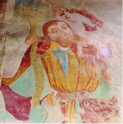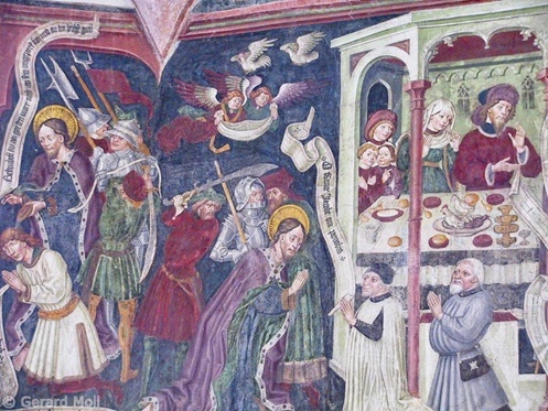 Bild in Lightbox öffnen (open image in lightbox). Die Pfarrkirche zum hl. Johannes wurde 1490 geweiht. Hochaltar mit strengem Säulenaufbau und rundem Tabernakel. Wandgemälde St. Christoph mit Landschaft.