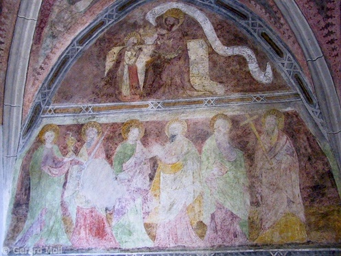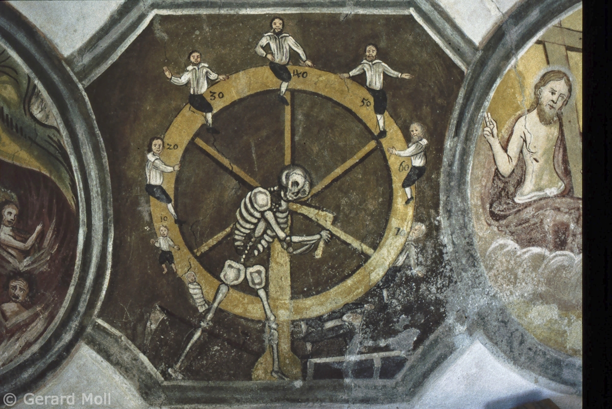 Bild in Lightbox öffnen (open image in lightbox). Die romanische Friedhofskapelle wurde im 17. Jahrhundert umgebaut. Von besonderem Interesse ist die Wandmalerei mit der Darstellung der Lebensalter.