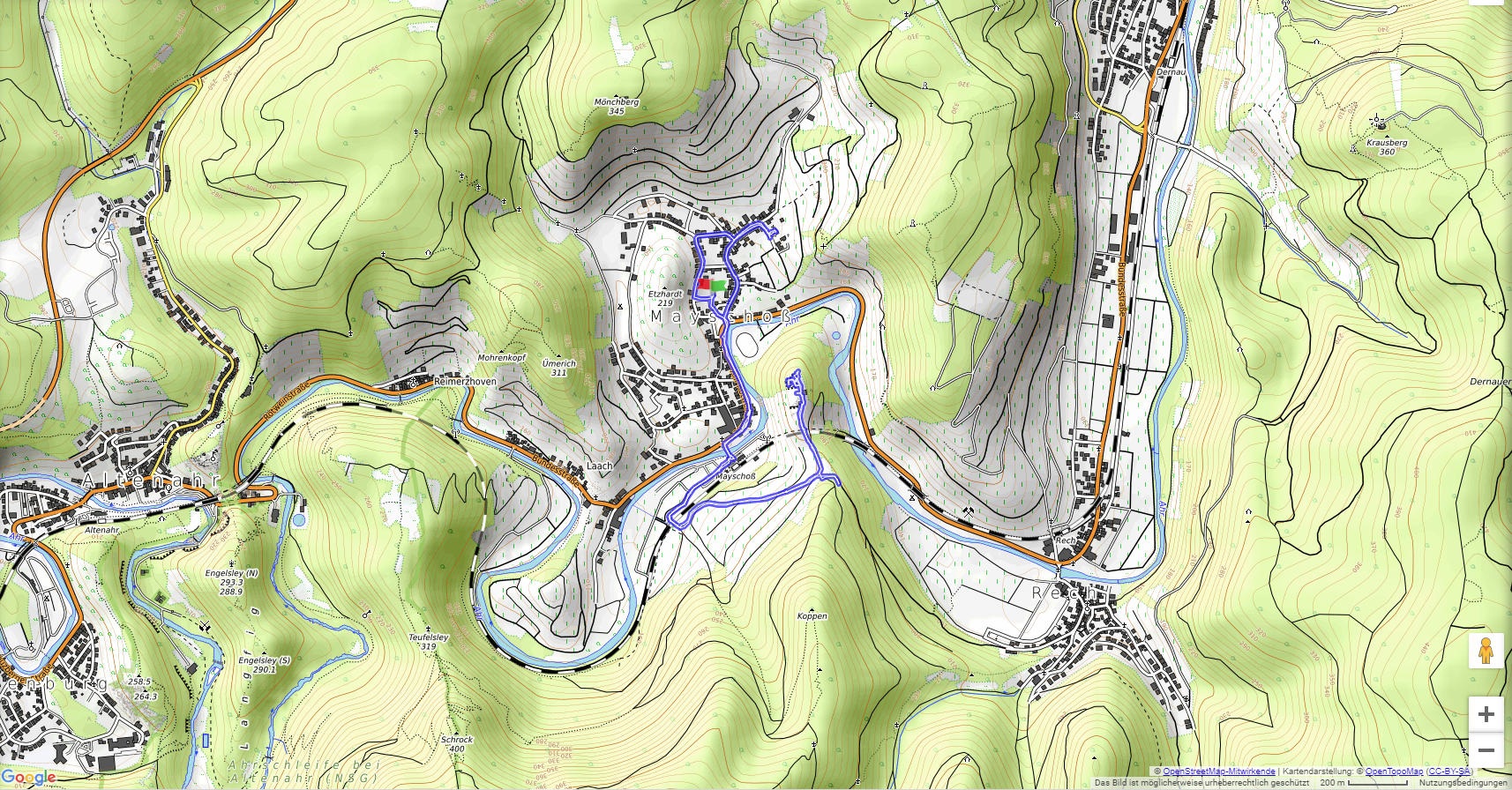Von Mayschoß führt ein kurzer Spaziergang auf die Saffenburg. Diese stammt aus dem 11. Jahrhundert und wurde im Jahr 1704 gesprengt, nachdem sie durch einige Belagerungen in sehr schlechtem Zustand war.