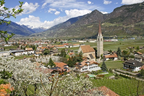 Zwischen Meran und Bozen erstrecken sich sonnige Obstplantagen und Weinhänge, begrenzt von den Bergen des Mendelkamms und des Tschögglberges. In Lana zweigt das 40 Kilmoeter lange, ursprüngliche Ultental ab, das bis zu den Gletschern der Ortlerberge hinaufsteigt.