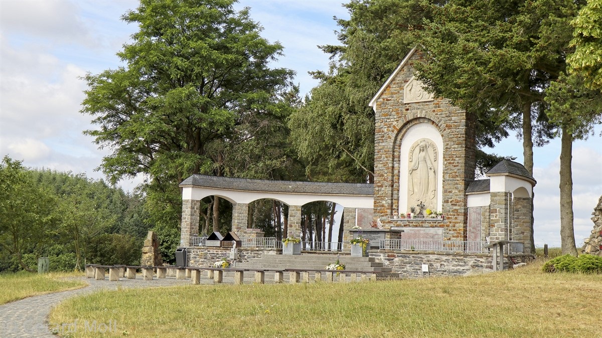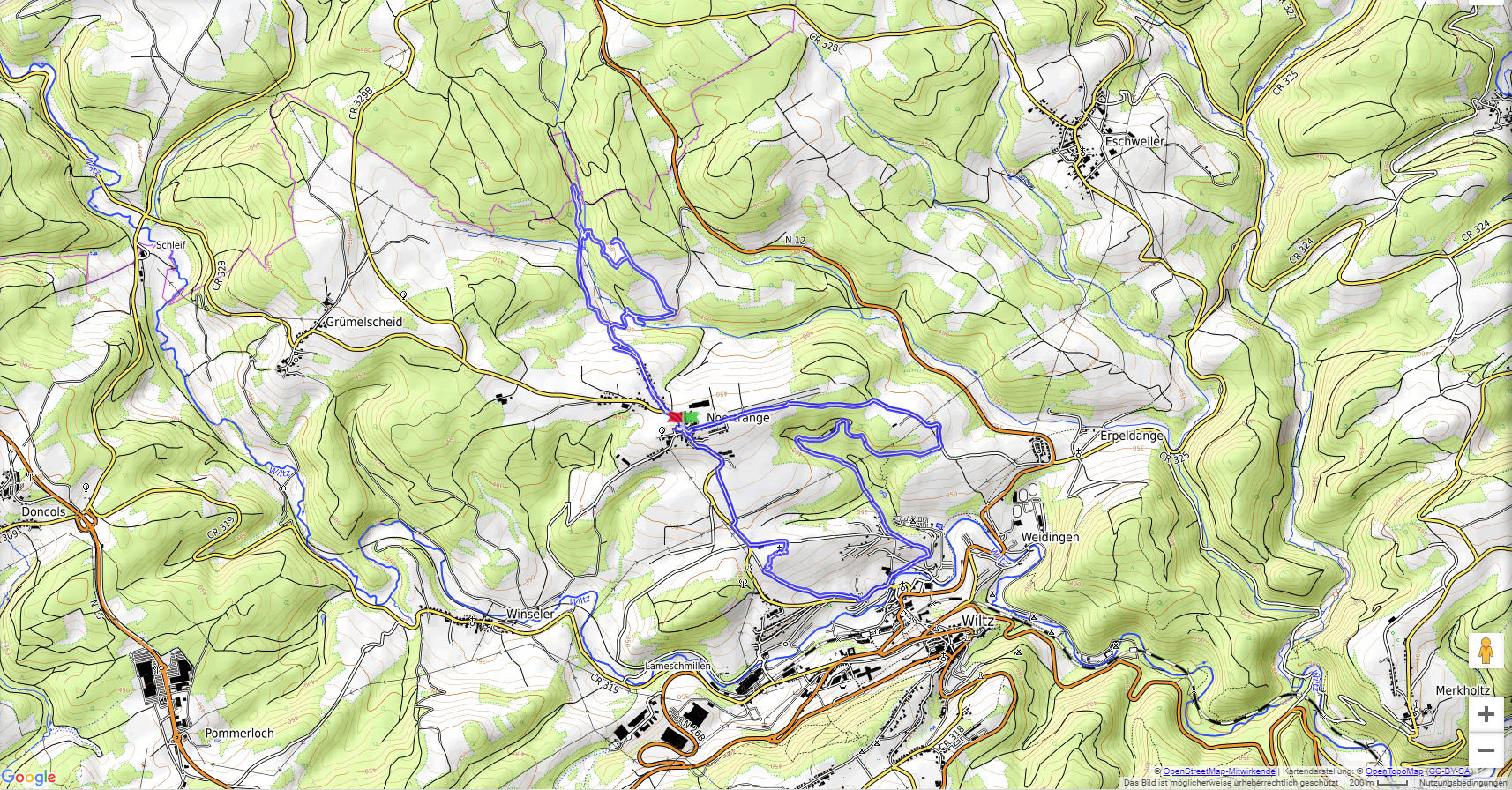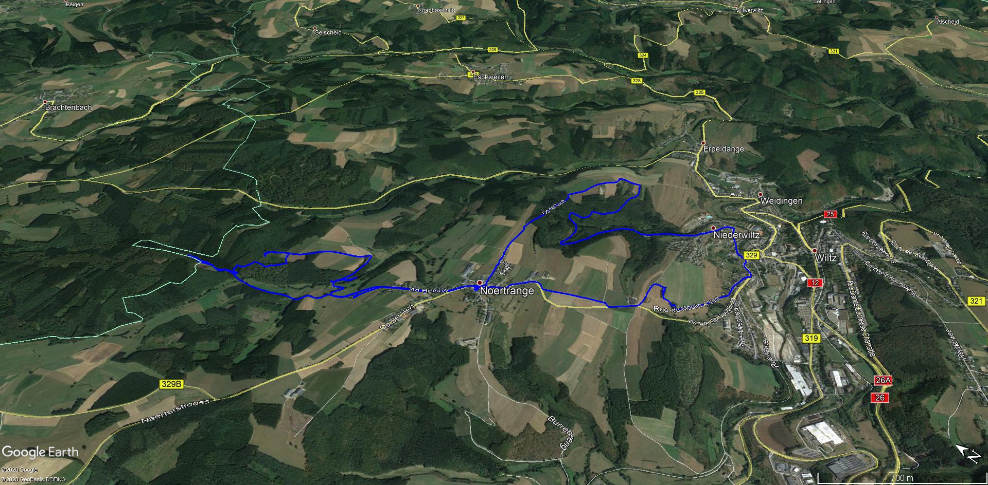 Von der Kirche in Noertrange folgen wir dem lokalen Wanderweg C, der uns zur Wallfahrt Fatima nahe Wiltz bringt. Dann geht es hinunter nach Niederwiltz von wo wir zum Flugfeld bei Noertrange aufsteigen. Ein Versuch, noch eine Schleife von Noertrange nach Norden zu gehen, war wenig lohnend und schwer zu finden.