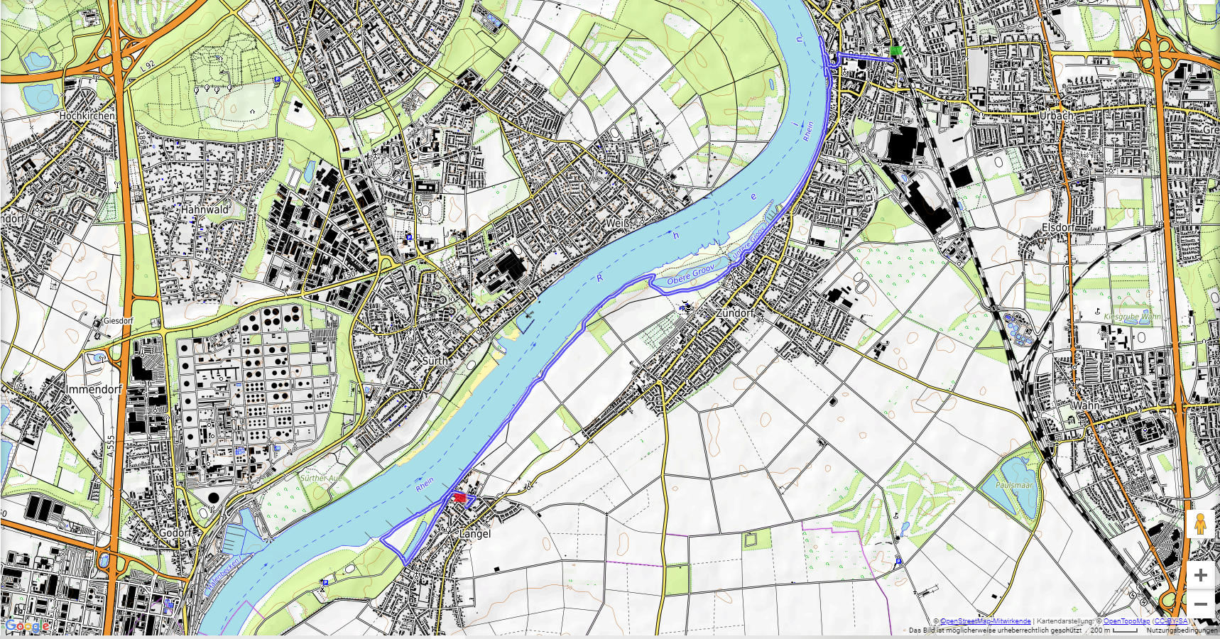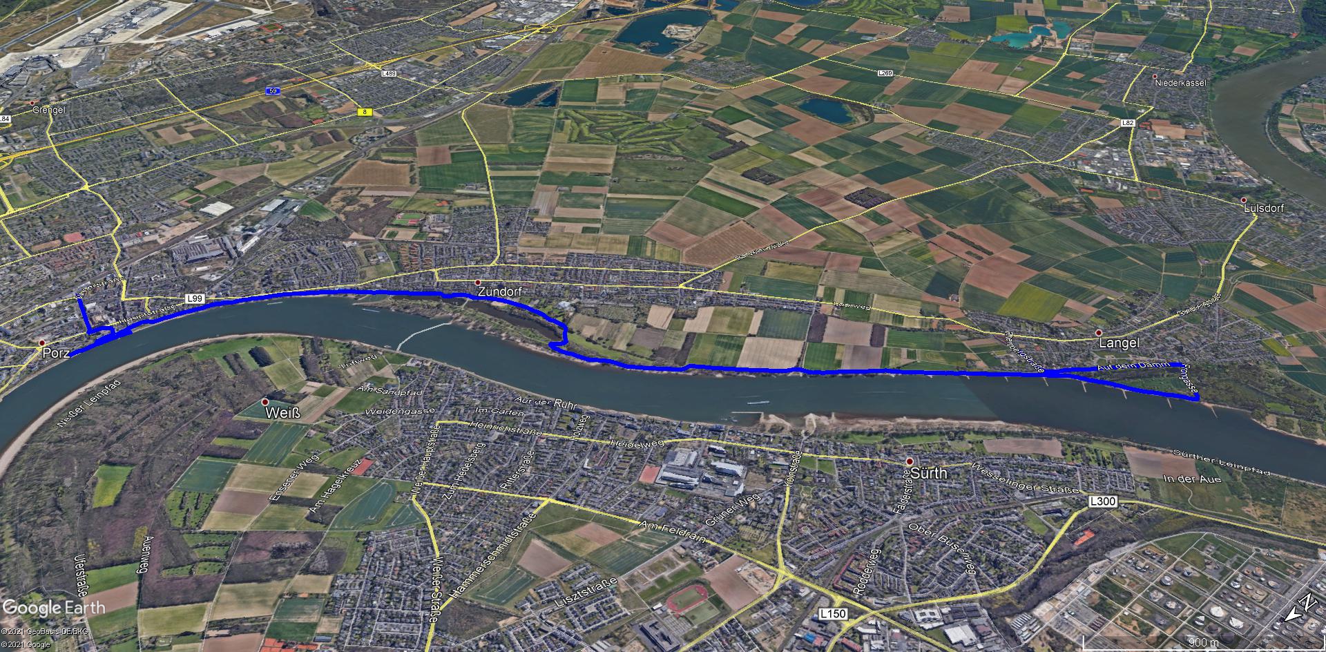Von Porz wandern wir am Rhein entlang nach Zündorf. Vom Erholungsgebiet Groov lohnt sich ein Abstecher zur katholischen Kirche St. Michael, die auf das 11. Jahrhundert zurückgeht. Mit etwas Glück kann man hier auch die heimisch gewordenen bunten Halsbandsittiche beobachten. Weiter am Rheinufer entlang erreichen wir Langel.