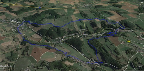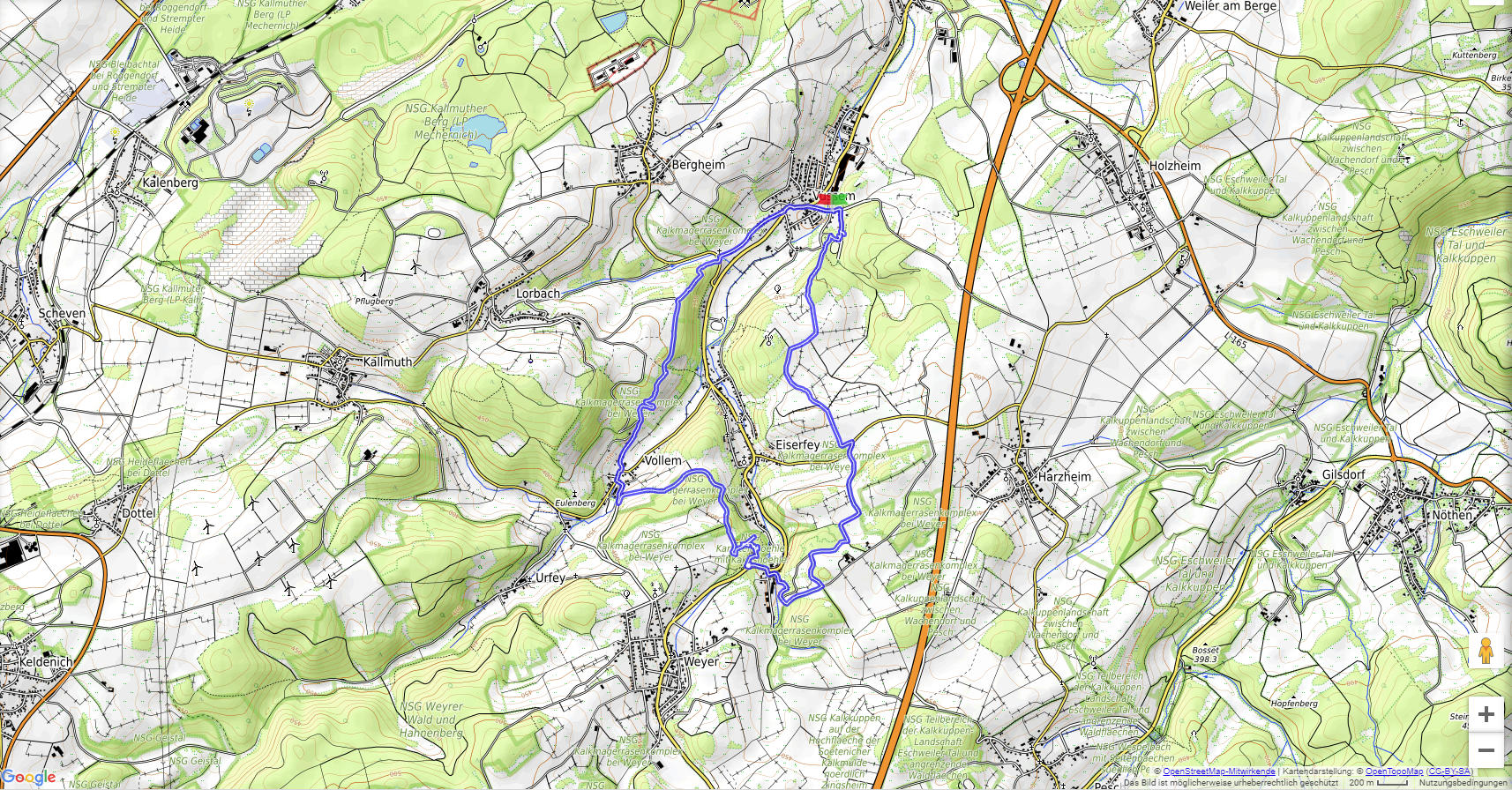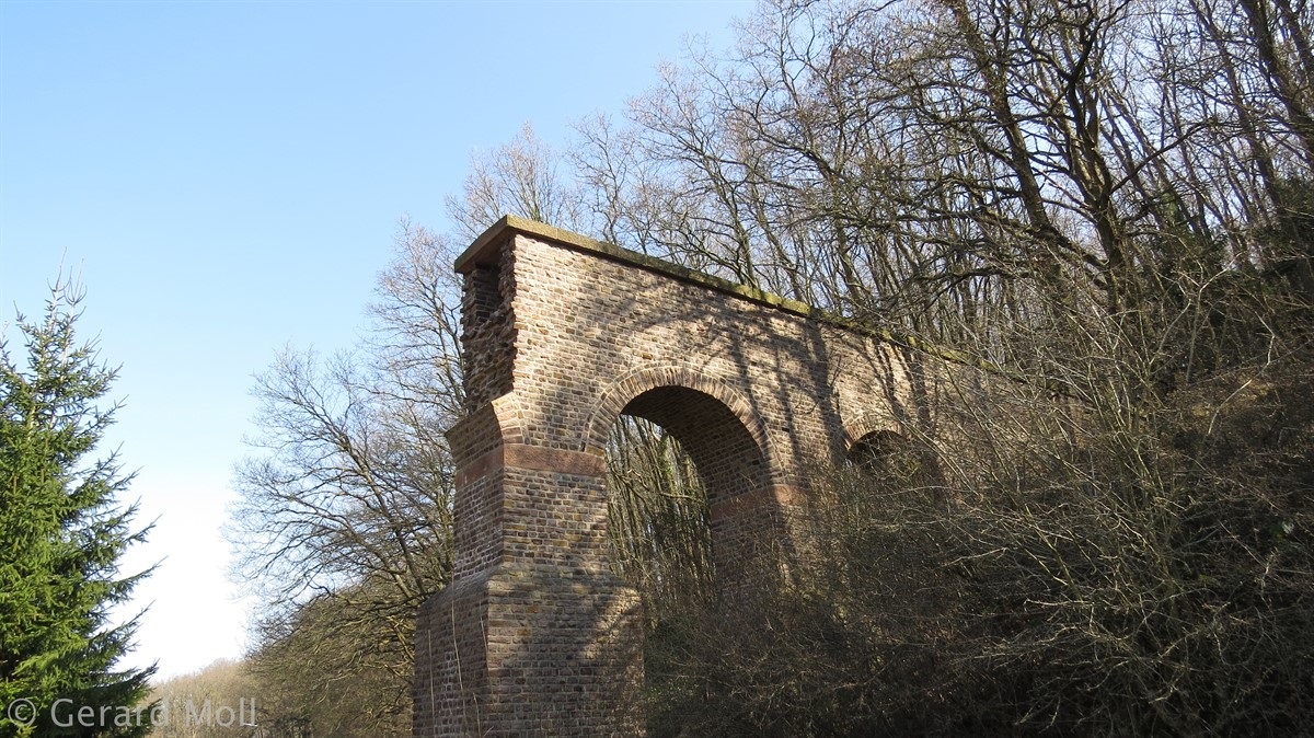 Wir parken in Vussem an dem 10 m hohen römischen Aquädukt und wandern in südlicher Richtung bis nach Dreimühlen. Hier bietet sich ein Abstecher zu der bereits von Neandertalern bewohnten Kakushöhle. Der aussichtsreiche Wanderweg führt über Eiserfey zurück nach Vussem.