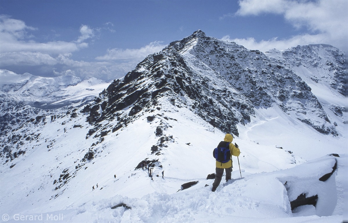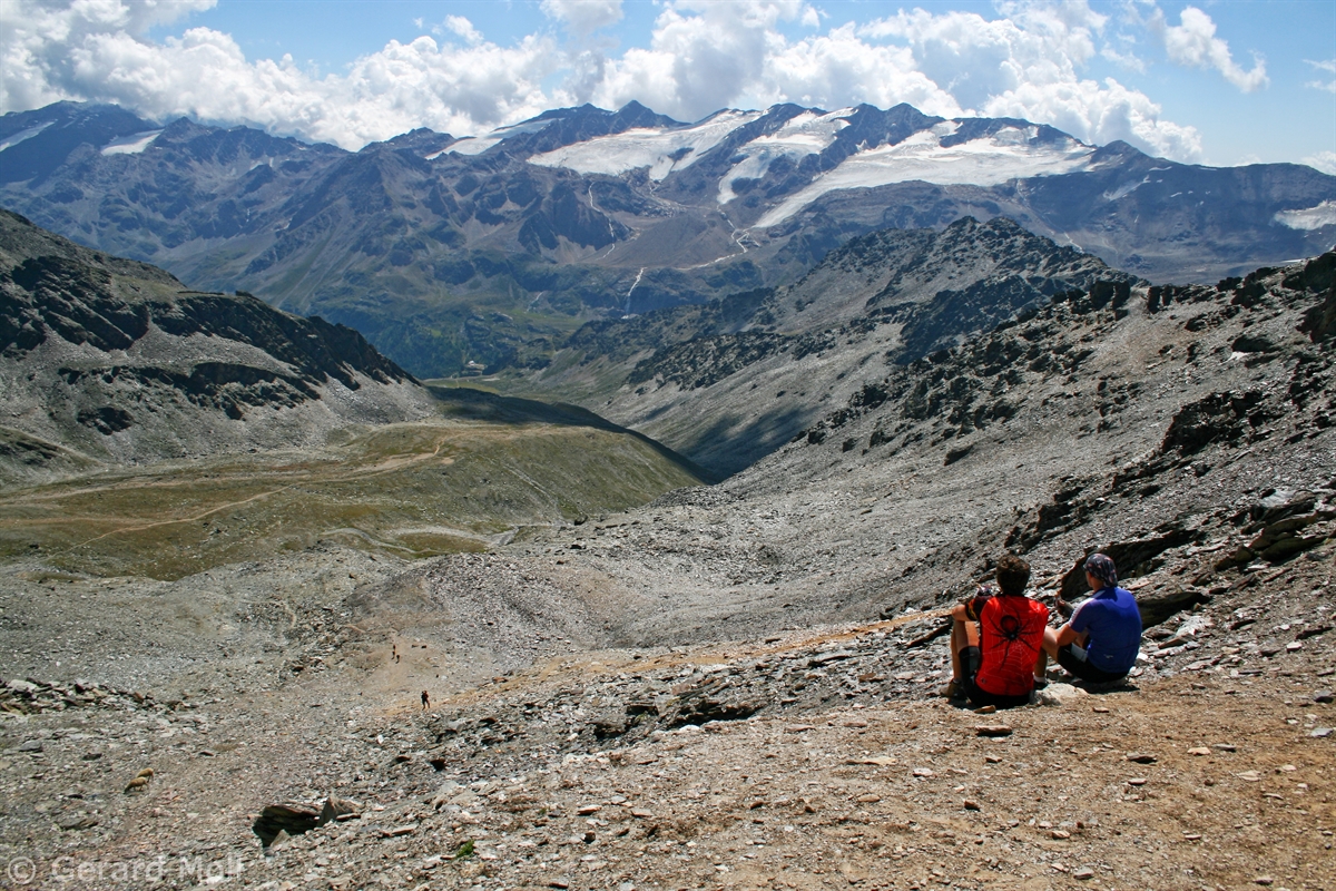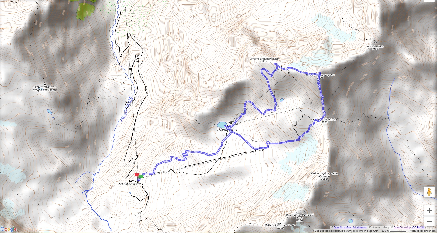 Von Sulden bringt uns die Seilbahn zur Schaubachhütte (2581 m). Ein guter Weg bringt uns über die Madritschhütte (2818 m) zum Madritschjoch (3123 m). Von dort geht es steil zum breiten Gipfel der Hinteren Schöntaufspitze (3325 m). Man kann auch ab der Madritschhütte auf Steigspuren über die Vordere Schöntaufspitze (3214 m) zum Gipfel gelangen. Der Weg aus dem Martelltal (2051 m) über die Zufallhütte ist landschaftlich ebenfalls sehr lohnend, aber deutlich länger.