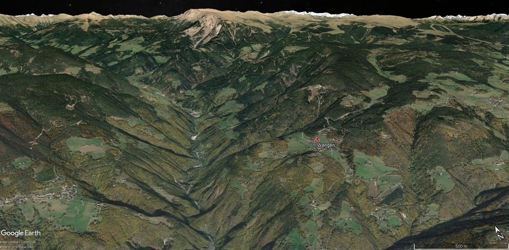Wangen liegt hoch über der Talferschlucht. Seit 1988 verbindet eine Strasse über Wangen das Sarntal mit dem Ritten.