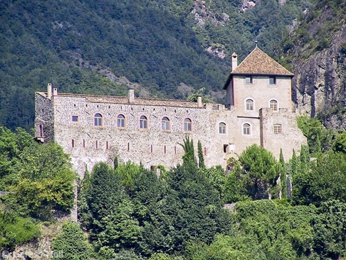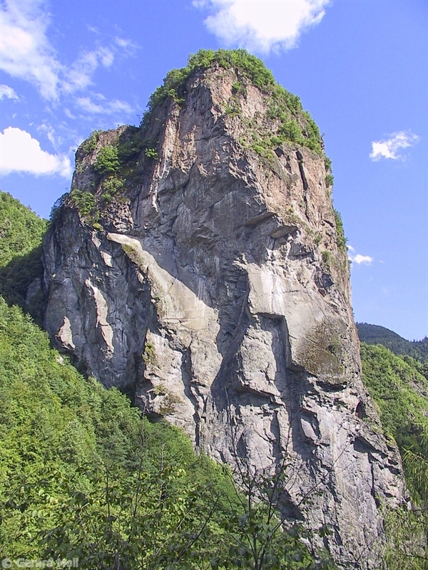 Bild in Lightbox öffnen (open image in lightbox). Blick aus dem Sarntal auf den senkrechten Felskopf, auf dem sich die Kirche St. Johann am Kofel befindet.