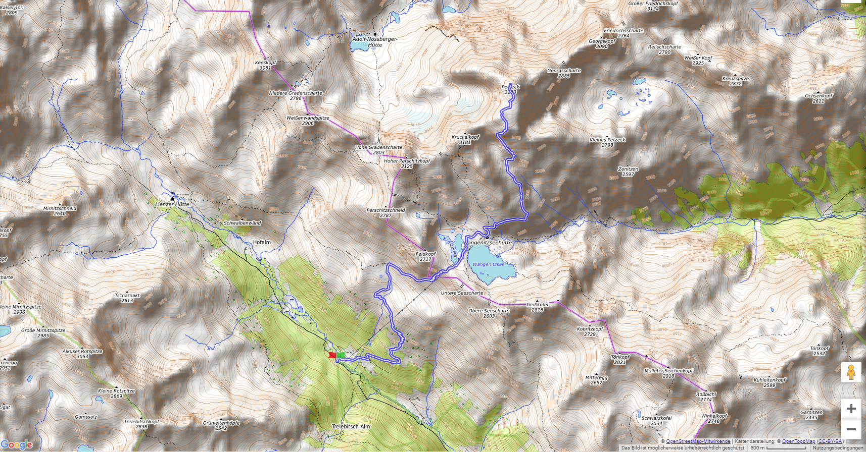 Wieder ist Seichenbrunn im Debanttal (1673 m) der Ausgangspunkt. Über die Untere Seescharte (2529 m) erreichen wir die Wangenitzseen mit der Wangenitzseehütte (2508 m). Noch einmal sind fast 800 Höhenmeter zu überwinden, dann stehen wir auf dem Petzeck, mit 3283 m dem höchsten Gipfel der Schobergruppe !