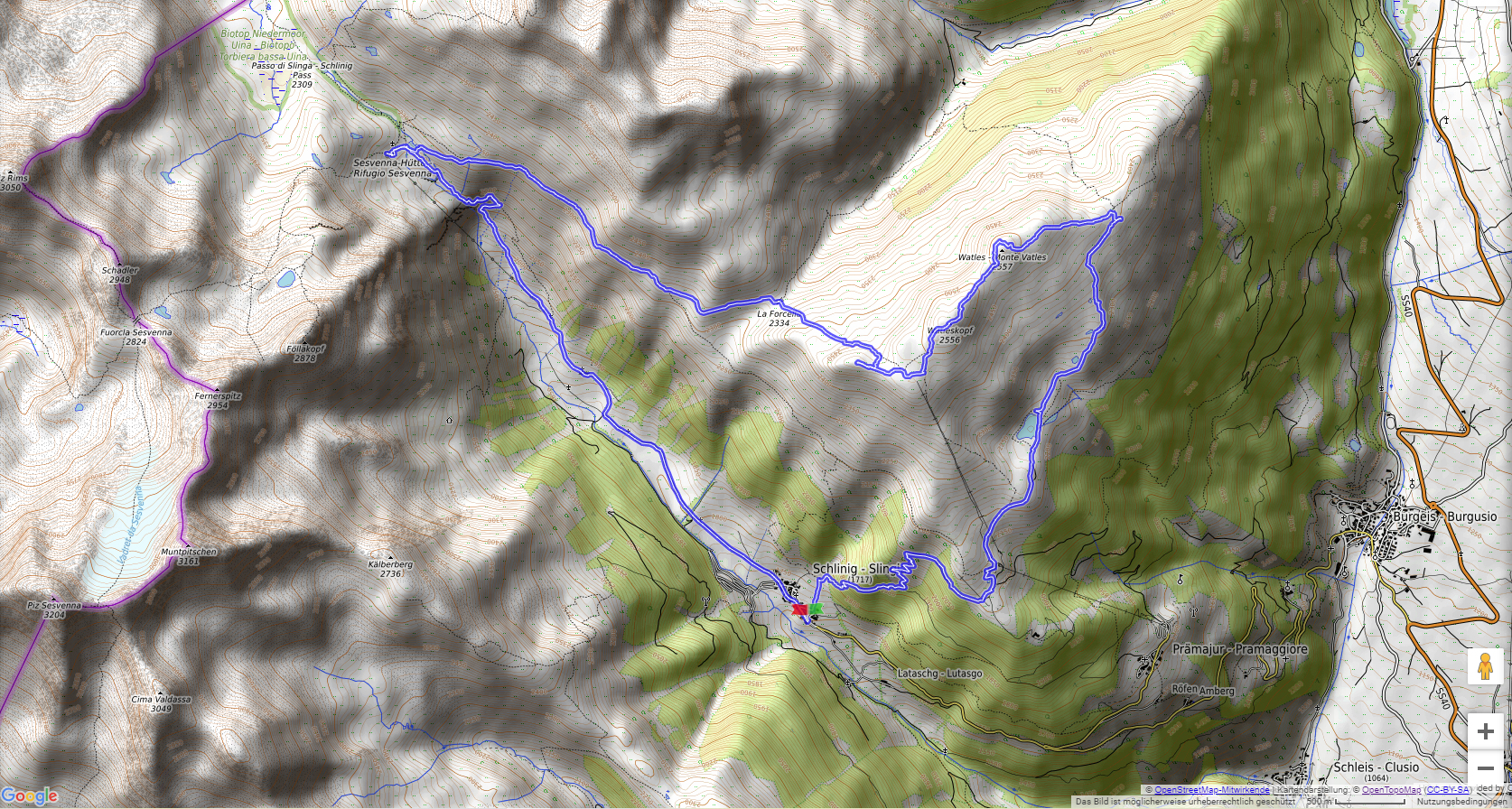 Die Tour zum Watles (2555 m) kann bei Benützung des Sessellifts zur Plantapatschhütte (2150 m) stark abgekürzt werden. Wir sind von Schlinig (1738 m) zur Plantapatschhütte aufgestiegen, von dort über die schönen Pfaffenseen und den Galtberg (2537 m) zum Watles gegangen. Der Abstieg erfolgte über die Sesvennahütte zurück nach Schlinig.