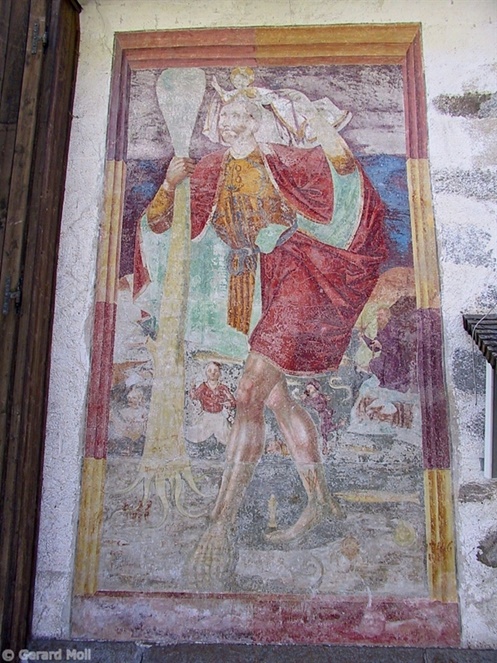 Bild in Lightbox öffnen (open image in lightbox). Der hl. Christoph an der Aussenwand der Pfarrkirche aus dem 15. Jahrhundert.