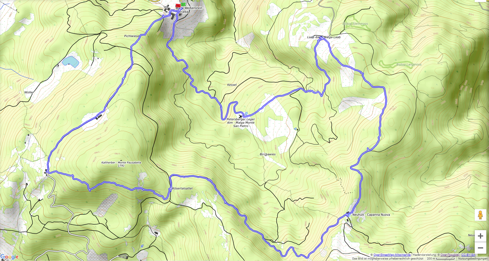 Wir parken bei dem Kloster Maria Weissenstein (1514 m). Über die Schönrastalm erreichen wir die Schmiederalm (1674 m) und über den Kösertalsattel die Neuhüttalm (1791 m). Der Perlenweg bringt uns zur Laabalm und über den Petersberger Leger geht es zurück nach Maria Weissenstein.