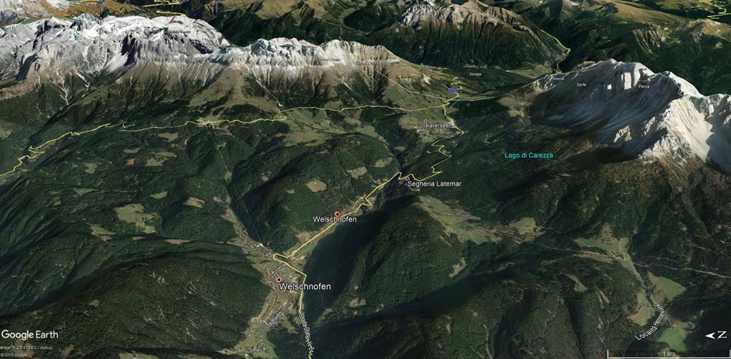 Der bedeutende Fremdenverkehrsort Welschnofen an der Großen Dolomitenstraße westlich des Karerpaßes ist durch seine Lage besonders begünstigt. Er liegt unweit der Rosengartengruppe und des Latemars.