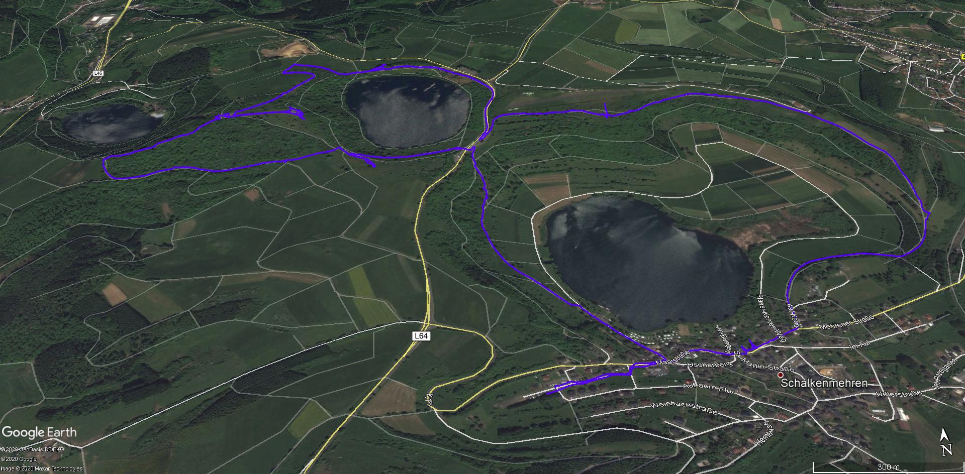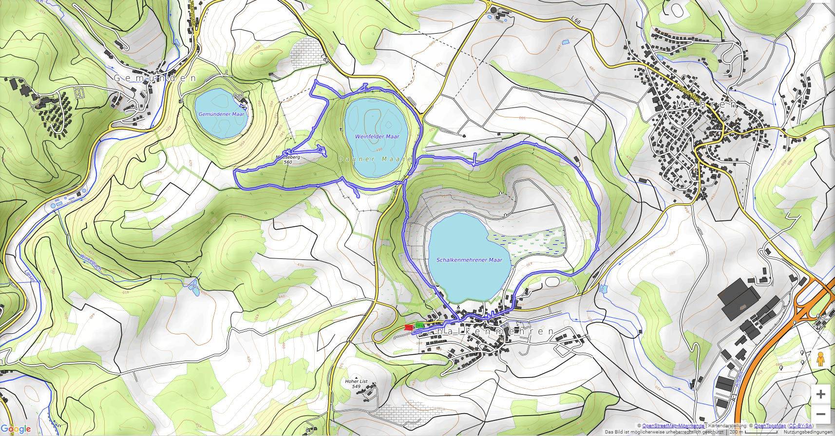 Wir starten auf dem großen Parkplatz in Schalkenmehren zu unserem ersten Ziel, dem Schalkenmehrener Maar. Etwas ansteigend erreichen wir das Südende des Weinfelder Maares (auch Totenmaar genannt). Vom Dronketurm blicken wir hinunter auf das 160 m tiefer liegende Gemündener Maar. Der Abstieg nach Norden bringt uns zur in Teilen aus dem 14. Jahrhundert stammenden Kapelle mit Friedhof am Totenmaar. Bei der Umrundung des Schalkenmehrener Maares kommen wir bei der tollen Aussicht beim Maarkreuz vorbei, ehe wir wieder nach Schalkenmehren absteigen.