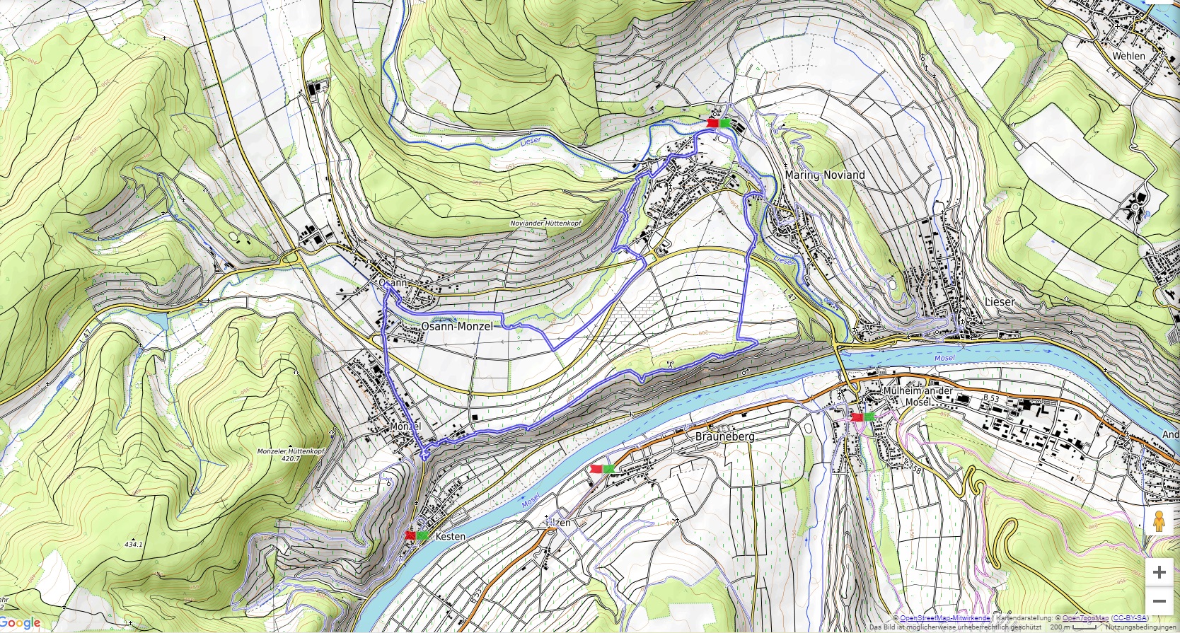 Bei diesem Wanderweg des Ferienlandes Bernkastel-Kues, markiert mit einem roten Herz mit Traube, starten wir in Maring-Noviand beim Klosterhof Siebenborn. Vorbei an der römischen Kelteranlage von Noviand geht es durch Wiesen nach Monzel. Dort folgen wir der Dorfstrasse nach Osann bis zur Kirche. Über den Brauneberg wandern wir entlang der Mosel und dann hinunter ins Liesertal zum Ausgangspunkt.