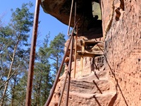 Wir parken am Ortseingang von Niedersteinbach und durchqueren den Ort. Dann führt der Weg in angenehmer Steigung hinauf zum Col de Hichtenbach und dem spektakulären Zigeunerfelsen. Weiter geht es zum Klingelfelsen und zu der sehenswerten Burg Wasigenstein. Der Weiterweg führt Richtung Tal, ein weiterer Anstieg bringt uns an dem mächtigen Wolfsfelsen vorbei zu den Ruinen des Château du Petit Arnsberg. An den Kletterfelsen des Schlossbergs vorbei kommen wir in den schönen Ort Obersteinbach. Durch den Ort und am Steinbach entlang geht es zurück zum Ausgangspunkt.