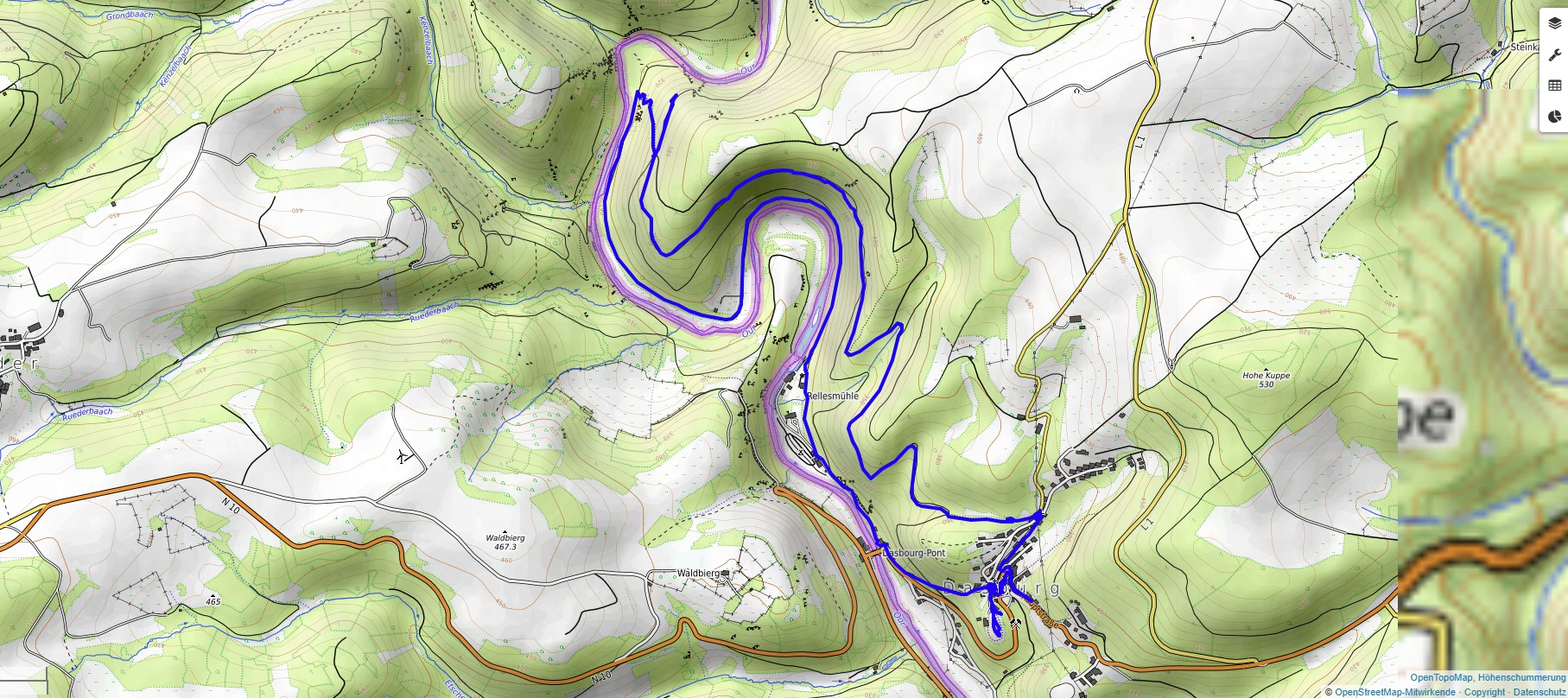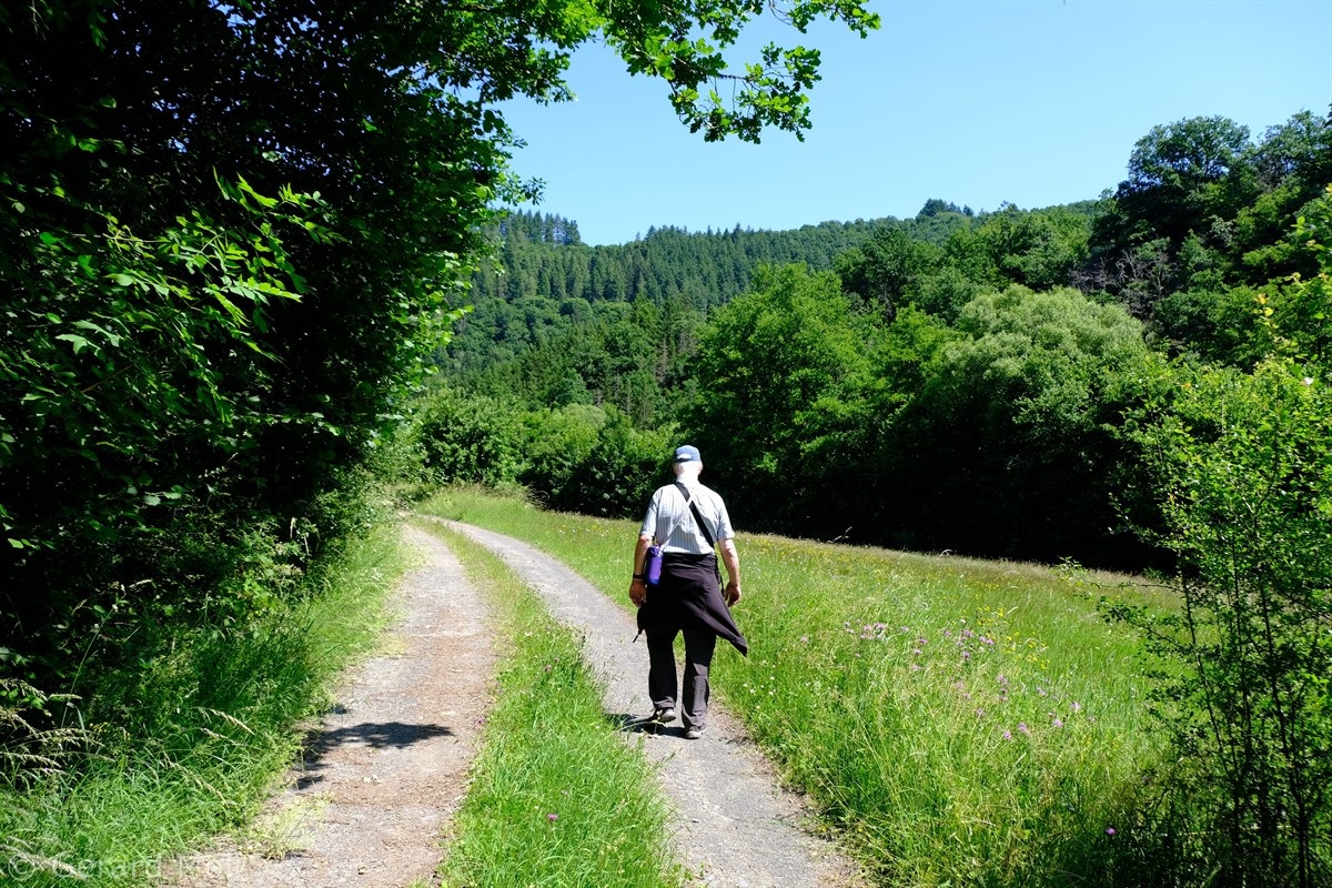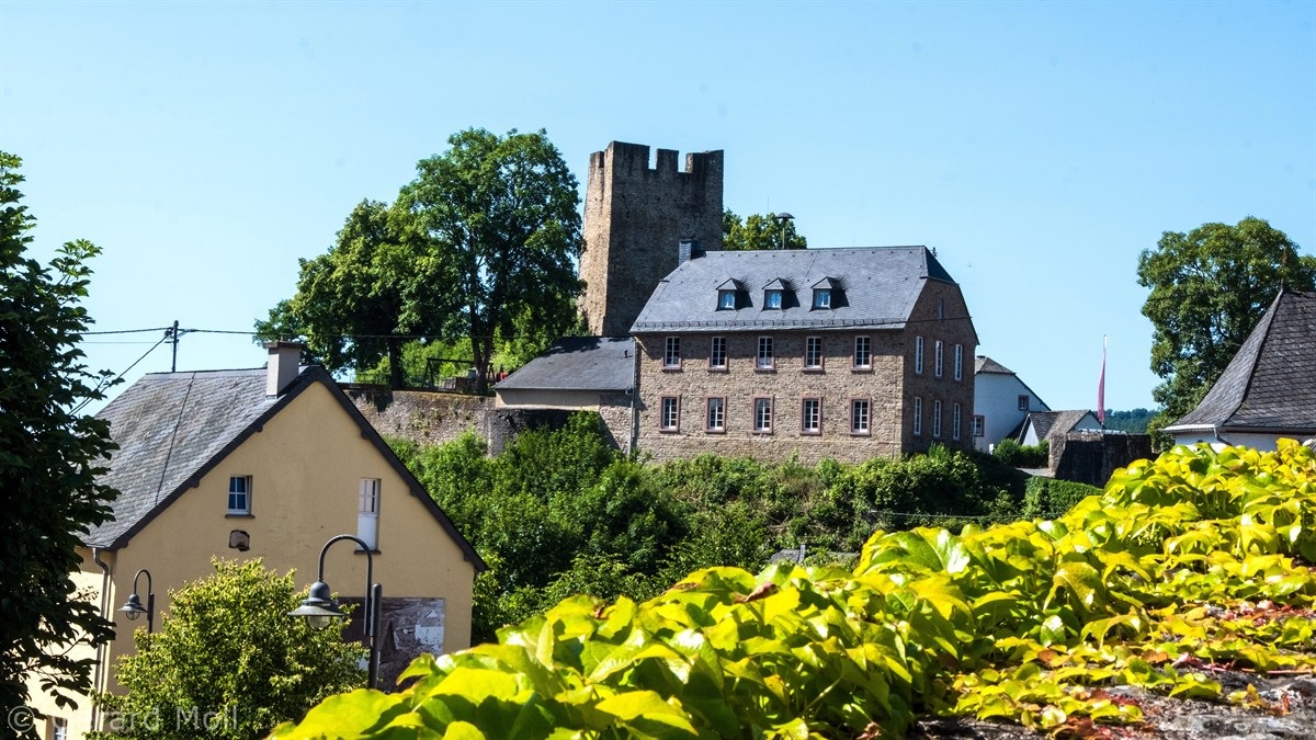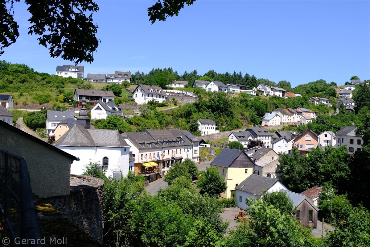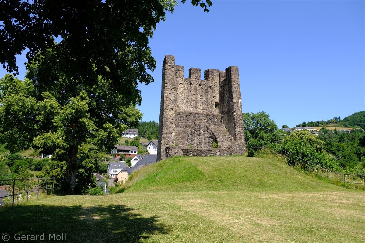 Wir parken im Ort und wandern bis zur Marienkapelle aus dem Jahr 1638. Dann folgen wir weiter der Markierung des Weges Nr. 9 mit schönen Ausblicken über das Tal der Our. Ein steiler Abstieg bringt uns ans Ufer des Flusses, dessen Verlauf wir bis zur Grenzbrücke nach Luxemburg folgen. Ein kurzer, steilerer Anstieg führt zurück in den Ort. In der westlichsten Gemeinde von Rheinland-Pfalz sind die Überreste der Burg aus dem frühen 13. Jahrhundert zu sehen. Auch die im Jahr 1767 erbaute Pfarrkirche St. Jakobus der Ältere lädt zu einem Besuch ein.