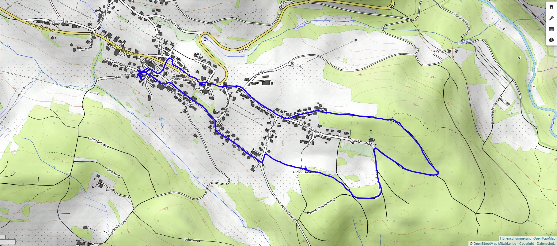 Einen Tag mit sehr unsicherem Wetter haben wir zu einer kleinen Runde in Kappel bei Lenzkirch genutzt. Von der Hochfirsthalle führt der Weg zu der sehenswerten Antoniuskapelle. Am Schützenhaus vorbei kommen wir zurück in den Ort mit dem hellblauen Alten Rathaus.