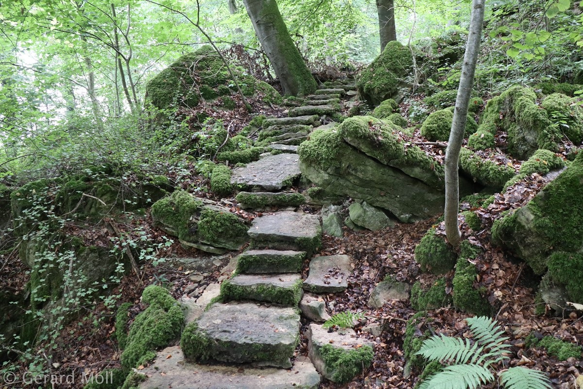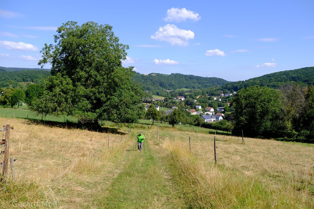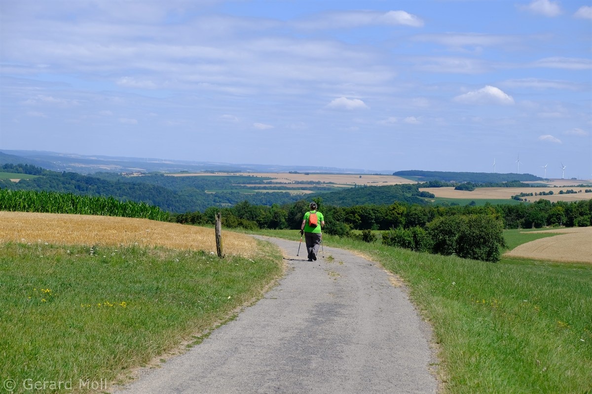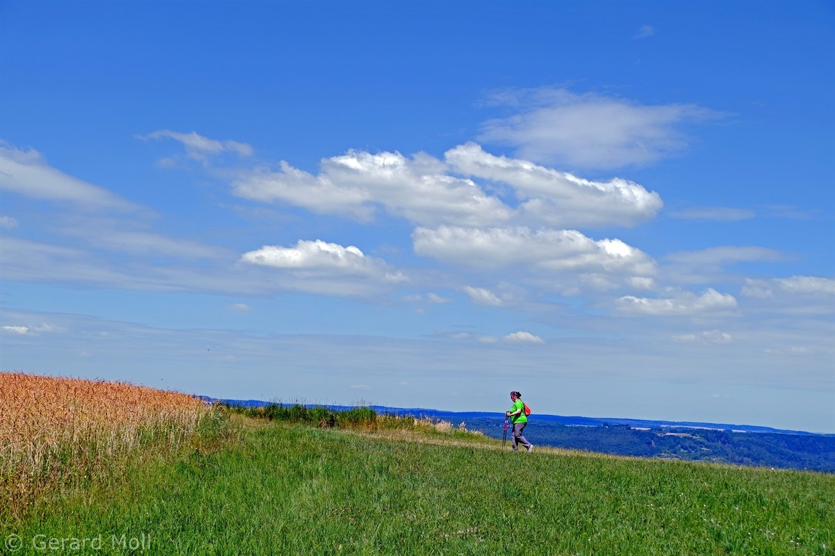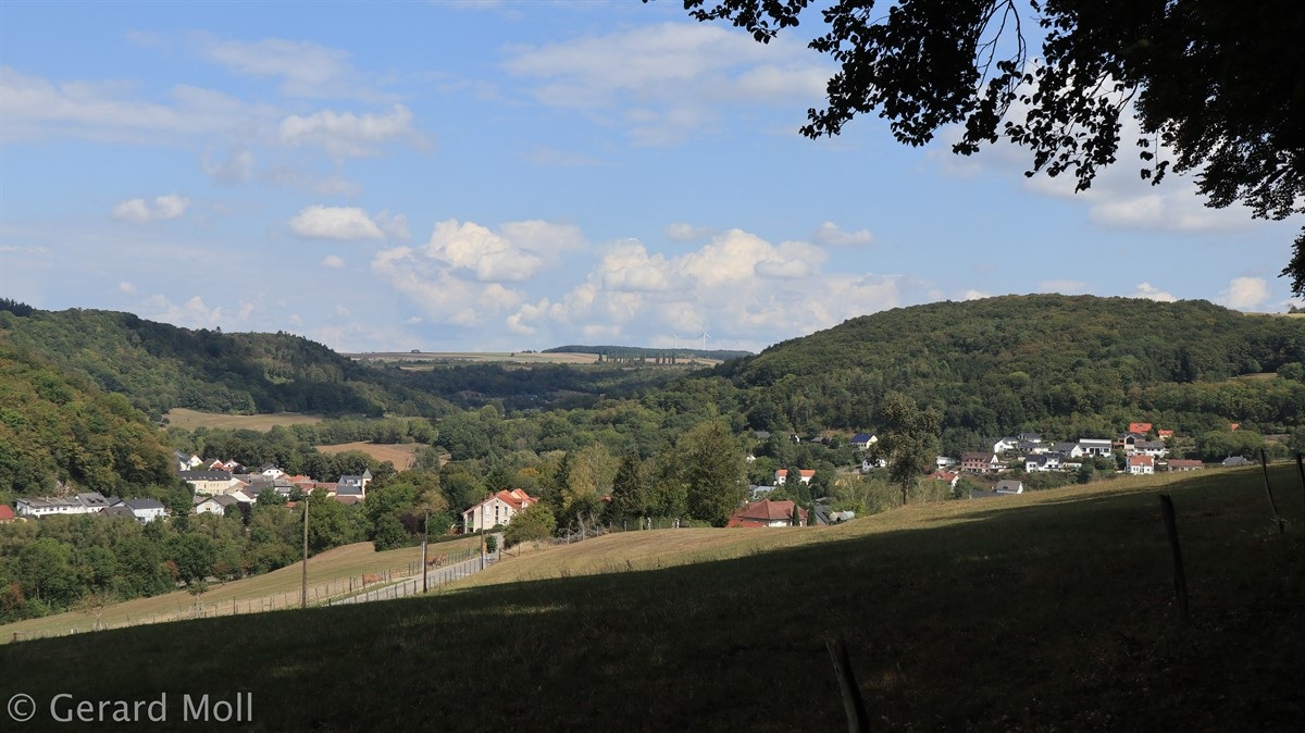 Wir parken in Steinheim bei dem "Centre d'intervention" und spazieren zuerst zur Kirche. Dann geht es, vorbei an der Mariengrotte und den "Gefale Leeën" hinauf zu den freien Feldern oberhalb des Ortes. Von der Unterstandshütte hat man einen herrlichen 360 Grad Panoramablick, der unter anderem bis nach Echternach reicht. An den interessanten Felsformationen der "Alkummer" vorbei erreichen wir dann wieder Steinheim.