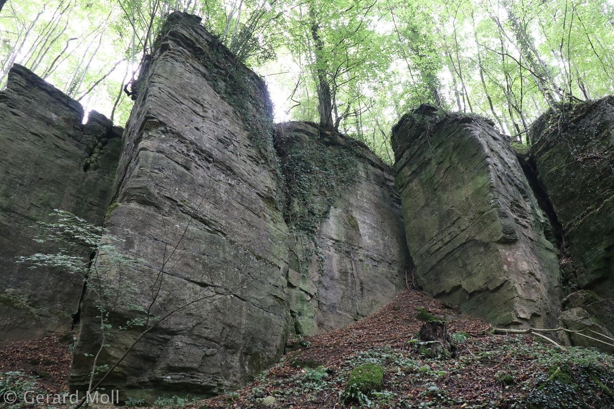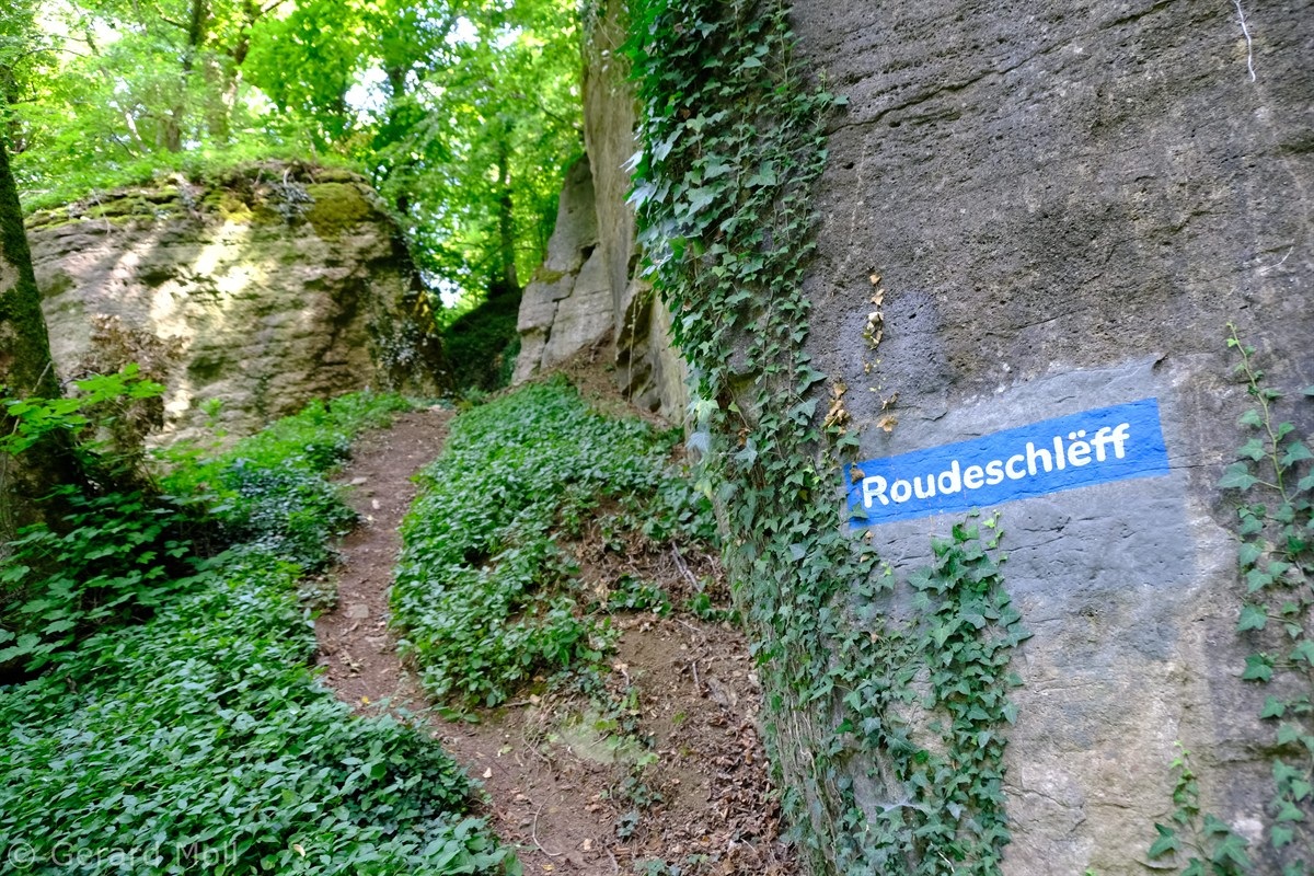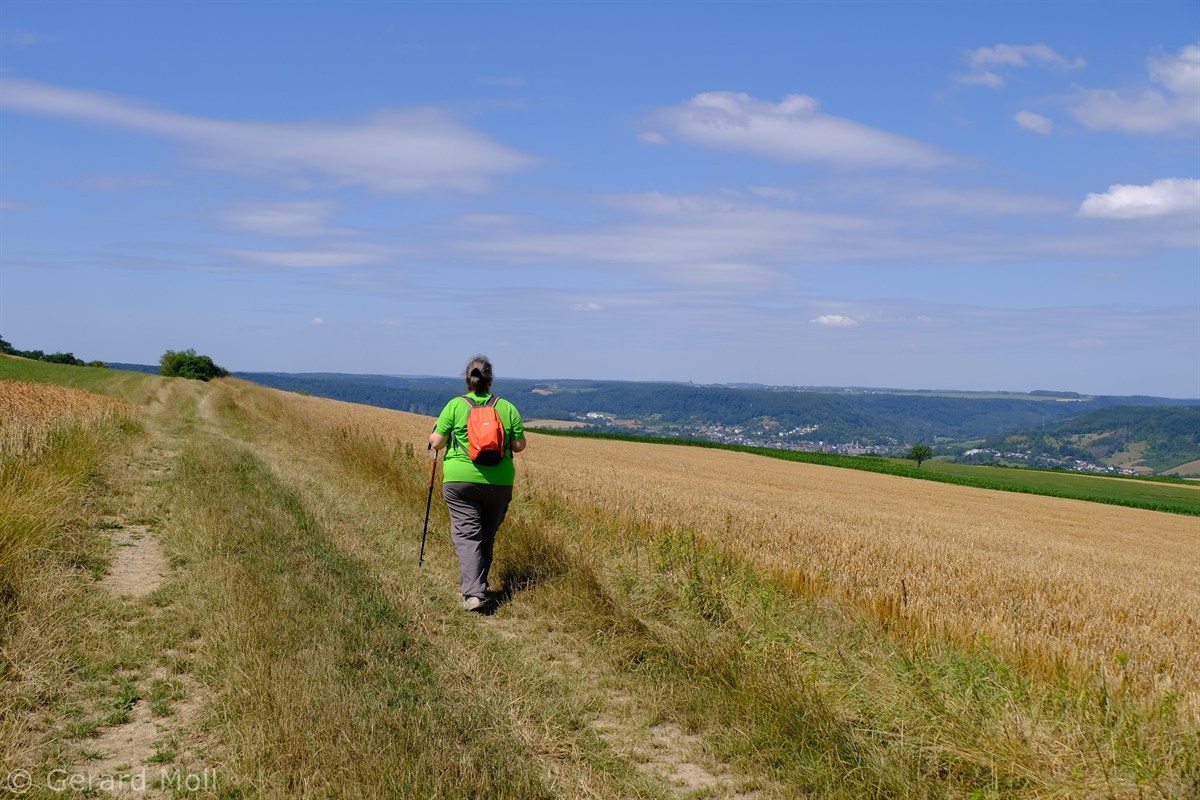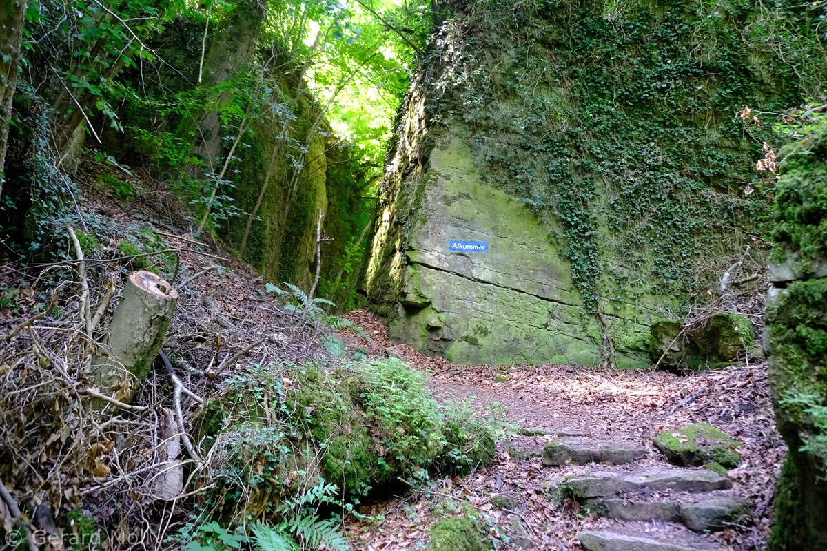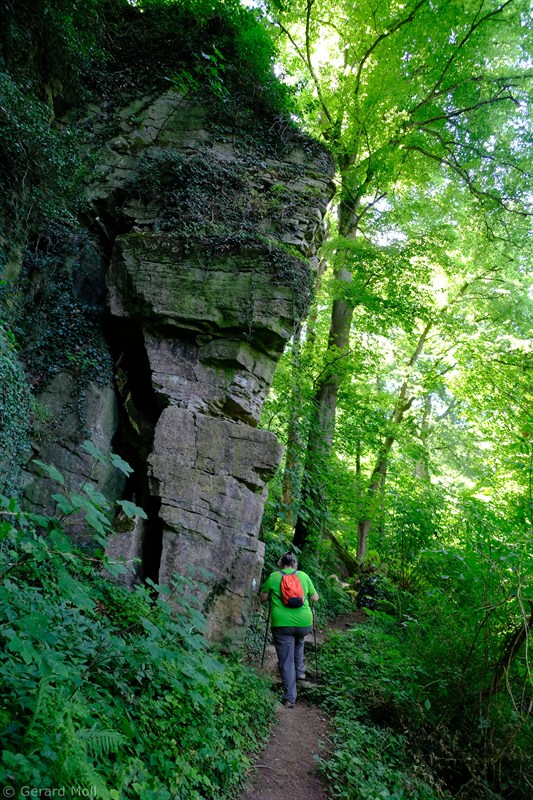 Wir parken in Steinheim bei dem "Centre d'intervention" und spazieren zuerst zur Kirche. Dann geht es, vorbei an der Mariengrotte und den "Gefale Leeën" hinauf zu den freien Feldern oberhalb des Ortes. Von der Unterstandshütte hat man einen herrlichen 360 Grad Panoramablick, der unter anderem bis nach Echternach reicht. An den interessanten Felsformationen der "Alkummer" vorbei erreichen wir dann wieder Steinheim.