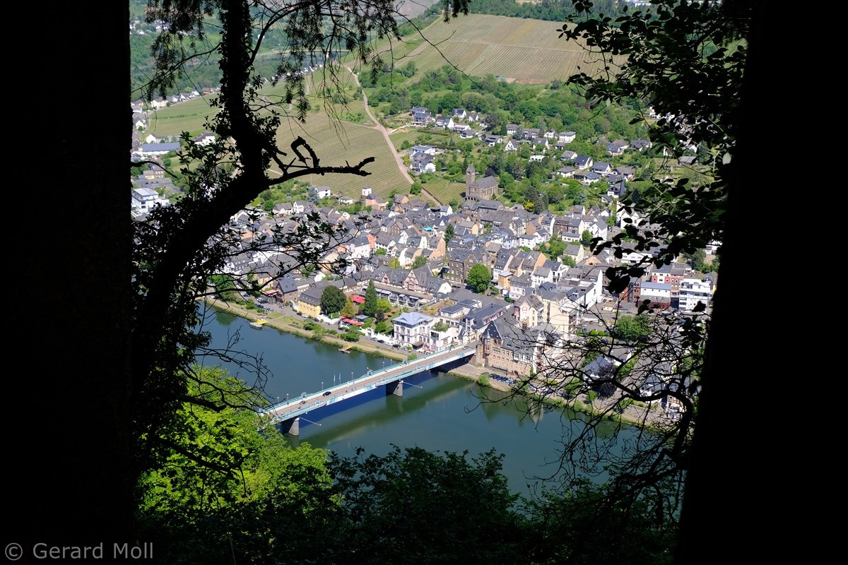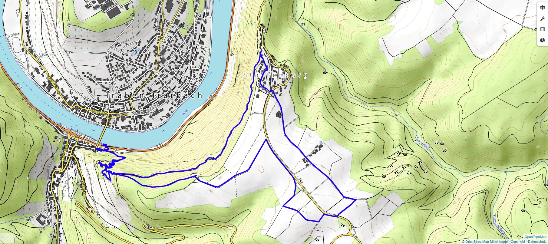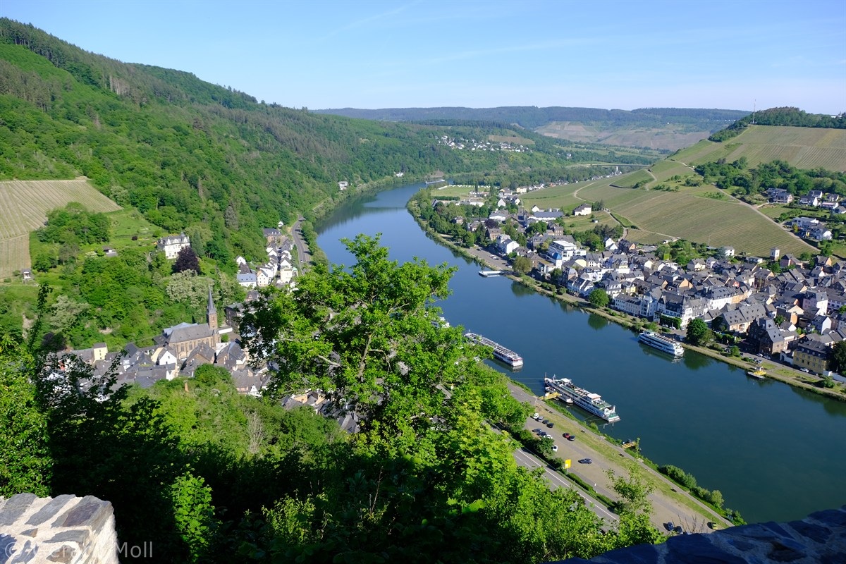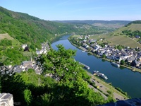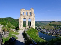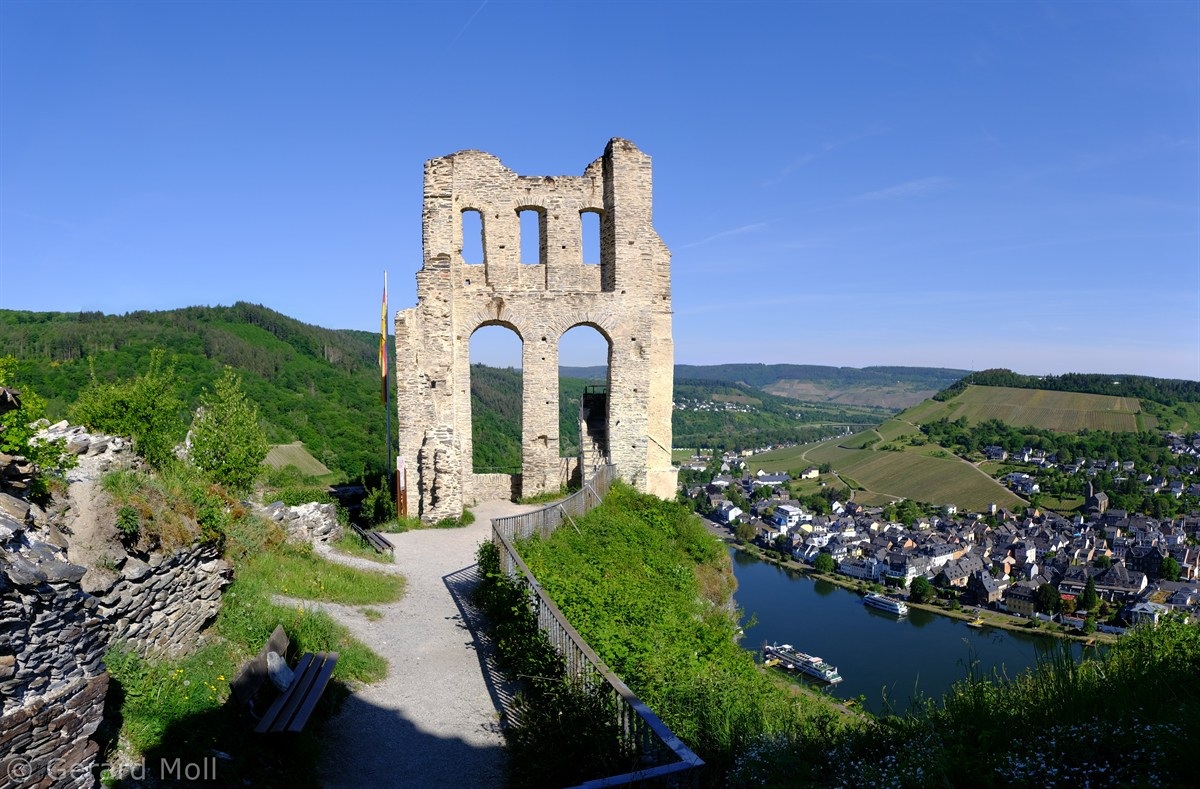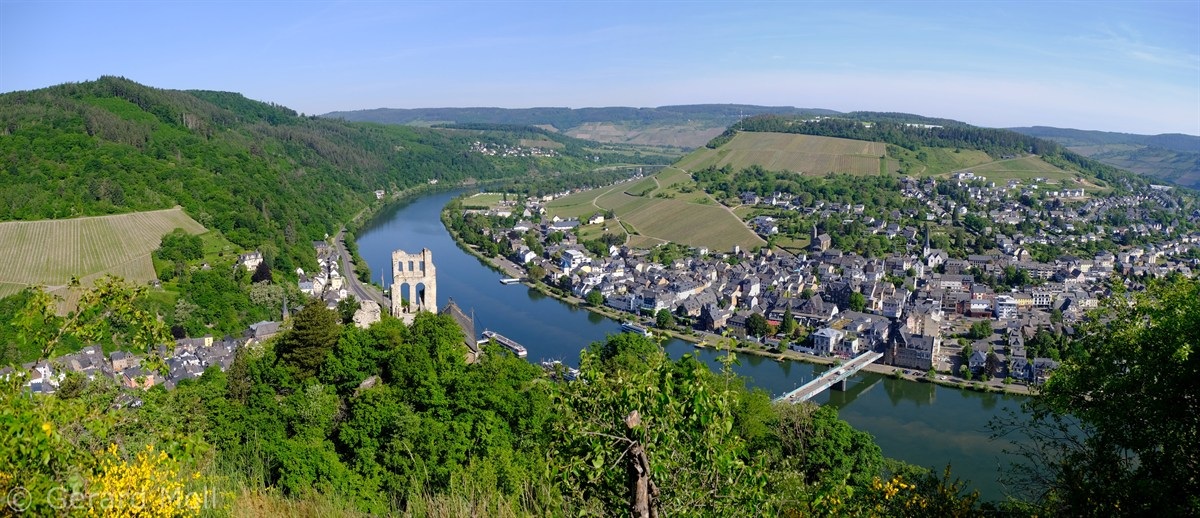 Vom Brückentor in Trarbach führt ein gut angelegter Serpentinenweg hinauf zu den Ruinen der Grevenburg. Nachdem wir den phantastischen Ausblick ausgiebig genossen haben, kraxeln wir den kurzen, gesicherten "Franzosensteig" hinauf auf den Schlossberg. Wir drehen eine Runde über das sonnige Hochplateau bis nach Starkenburg, wo sich uns eine großartige Aussicht auf Enkirch bietet. Durch Wald kehren wir zur Grevenburg zurück und steigen hinab zur Mosel.