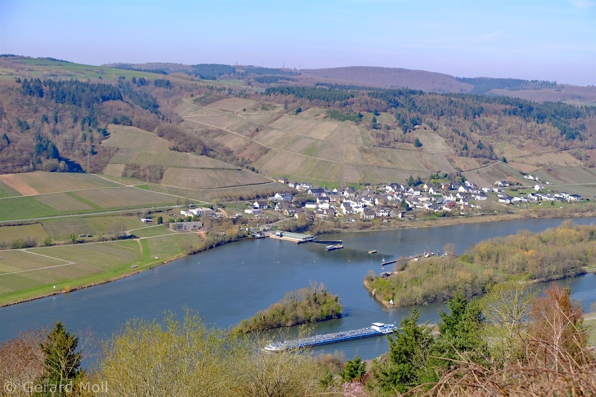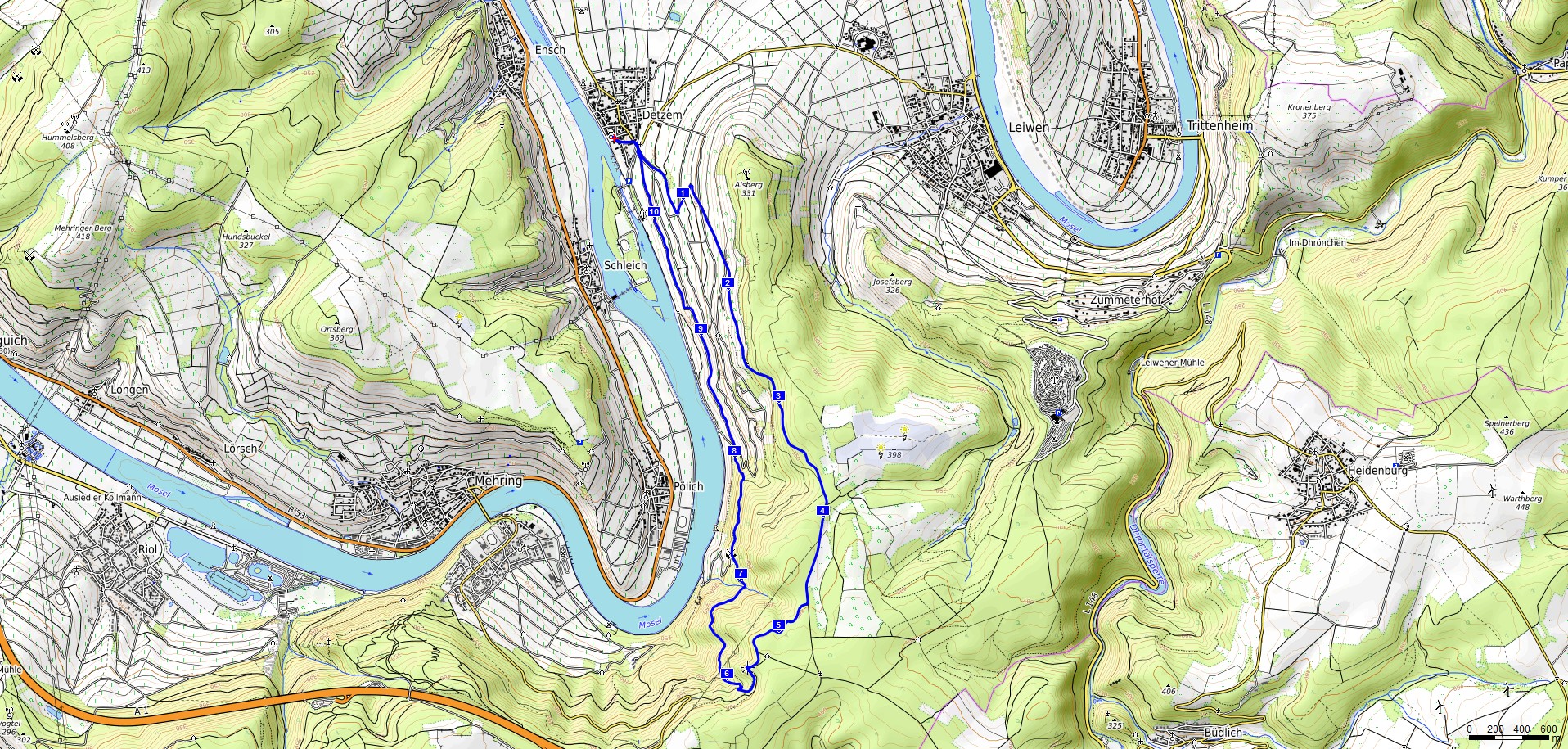 Von Detzem wandern wir, mit Blick auf die höchste Staustufe der Mosel, hinauf in die Weinberge, Durch Wald erreichen wir den 2023 sanierten Aussichtsturm, nach 105 Stufen haben wir oben einen herrlichen Blick auf die Mosel. Der Abstieg folgt eine ganze Weile dem Moselsteigseitensprung Mehringer Schweiz. Zum Schluss bringt uns der Wilhelm-Risse-Weg durch die Weinberge zurück nach Detzem.